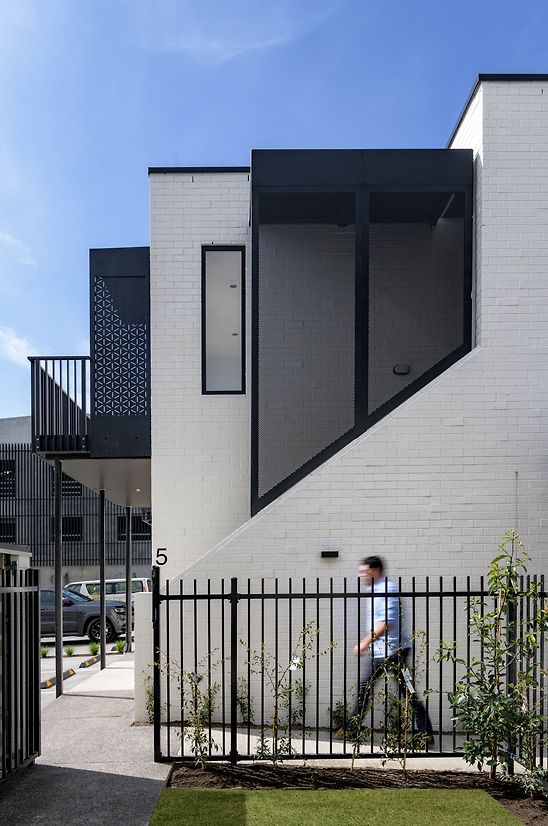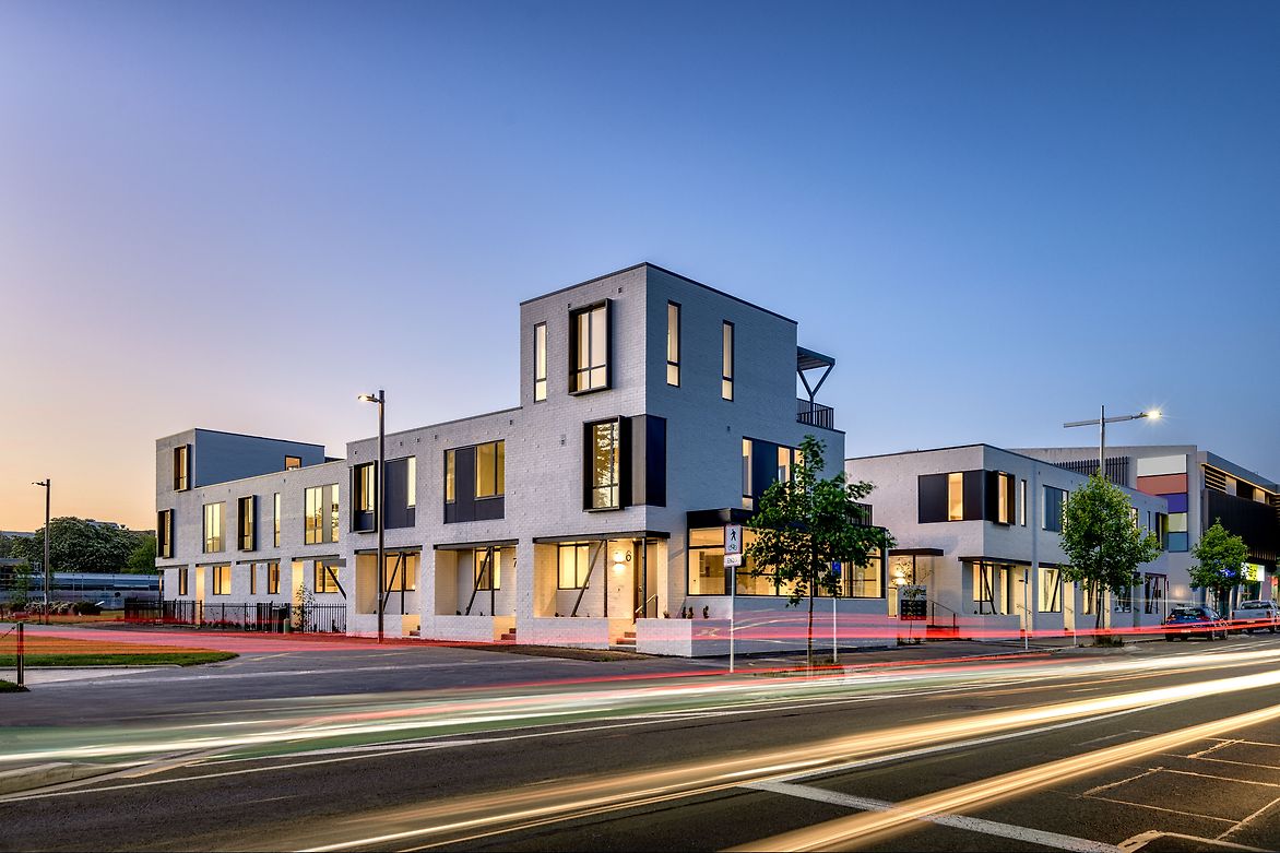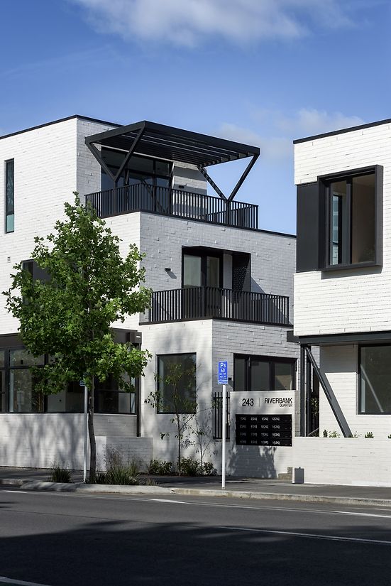 This central CBD apartment complex is a result of the clients brief to create a mixed-use development that is desirable to live in and reintroduces a social ecology back into the city. The design is a 2-3 storey complex of 14 mid to high market quality residential units and 4 street facing commercial tenancies. These units are designed as a mixed-use development with the flexibility of commercial and residential use. Block D (west) via its differential brick demarcation is purposefully set aside as the premium units inclusive of internal access garages. The combination of building typologies emphasizes this aspect by creating an environment for cross-pollination between residents and building users, creating positive relationships within the development and the wider CBD.