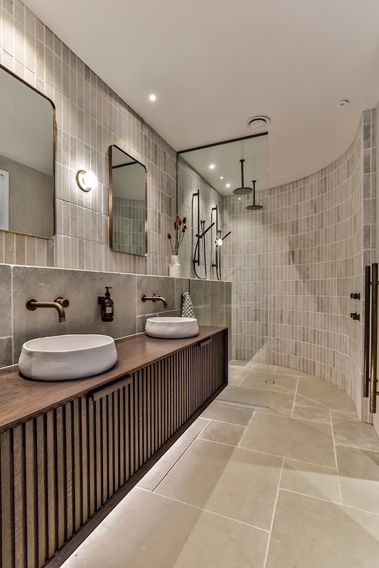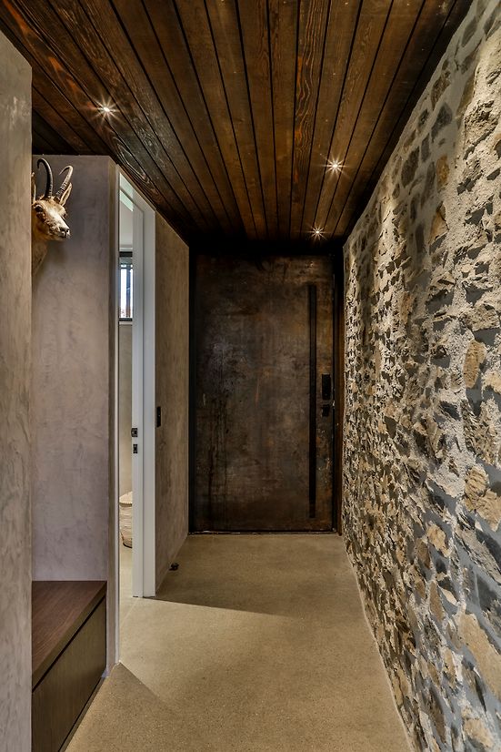Inside, the interior unfolds as a sanctuary of luxury and refinement. High ceilings give both spaciousness and a place for our client to display his trophy-hunted animals. The textured wall finishes invite tactile exploration. Curved shower walls and travertine tiles soften the masculine interior, and the fireplace and sunken lounge add a sense of warmth and serenity. The outdoor entertaining area is an elegant extension to the home design.