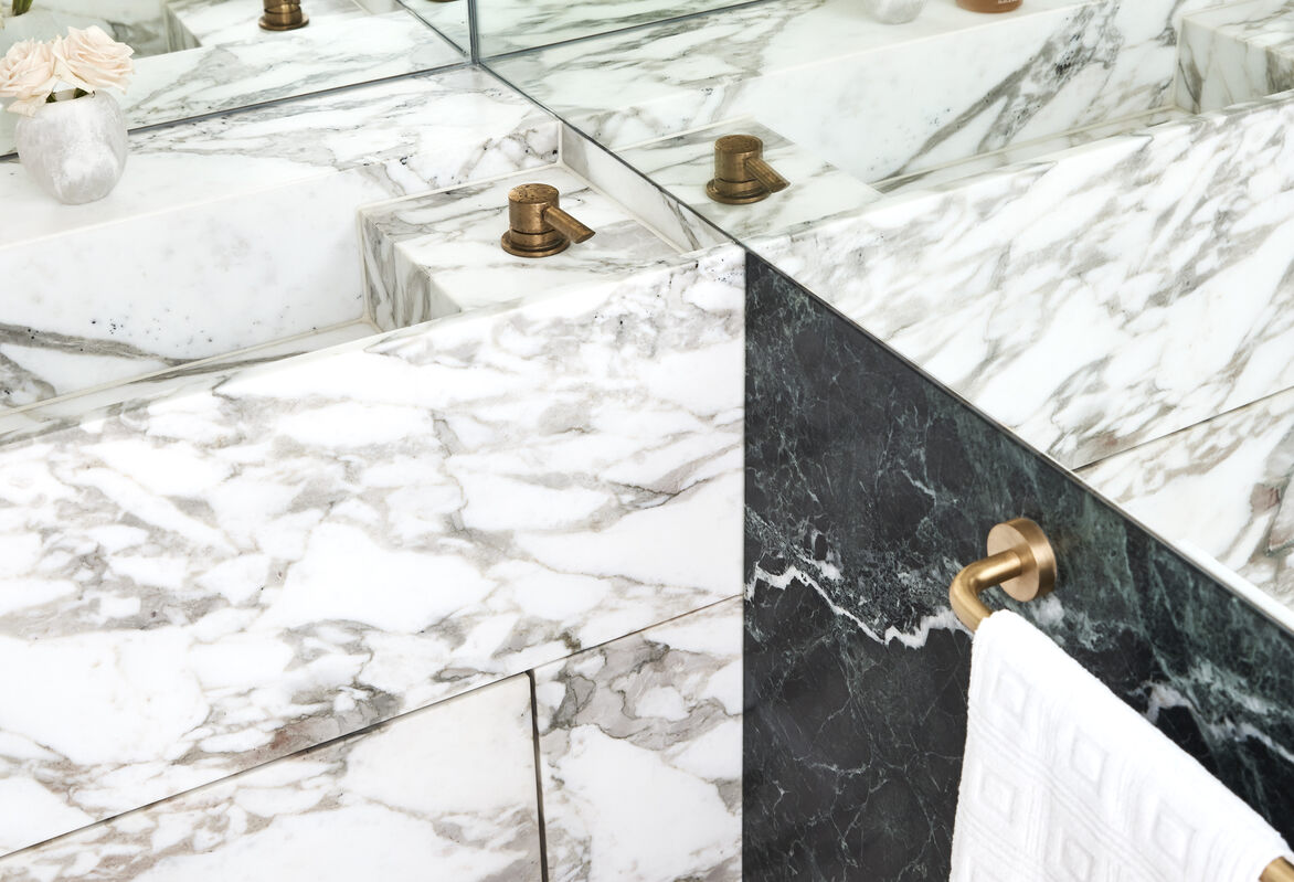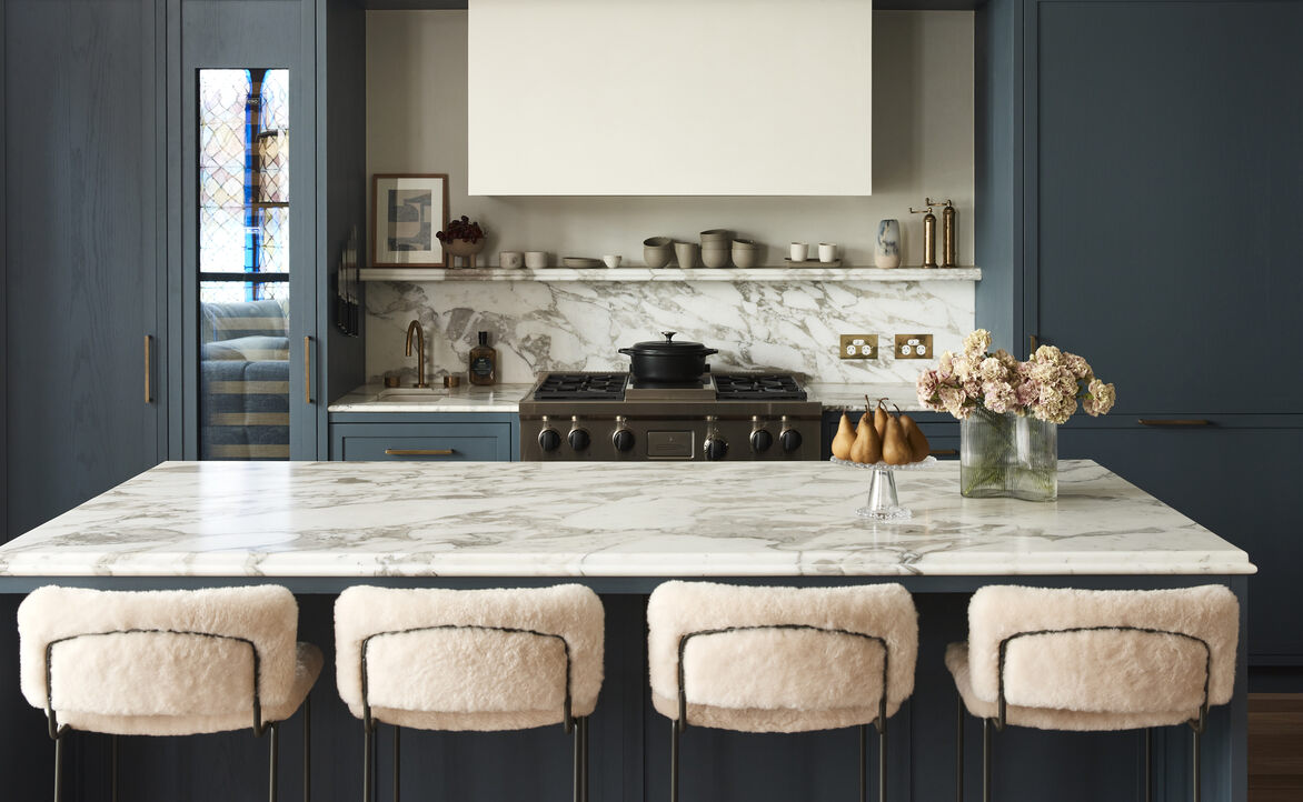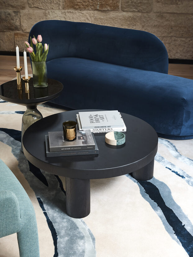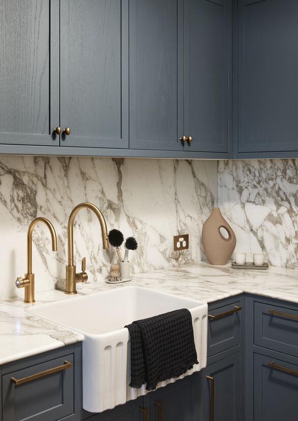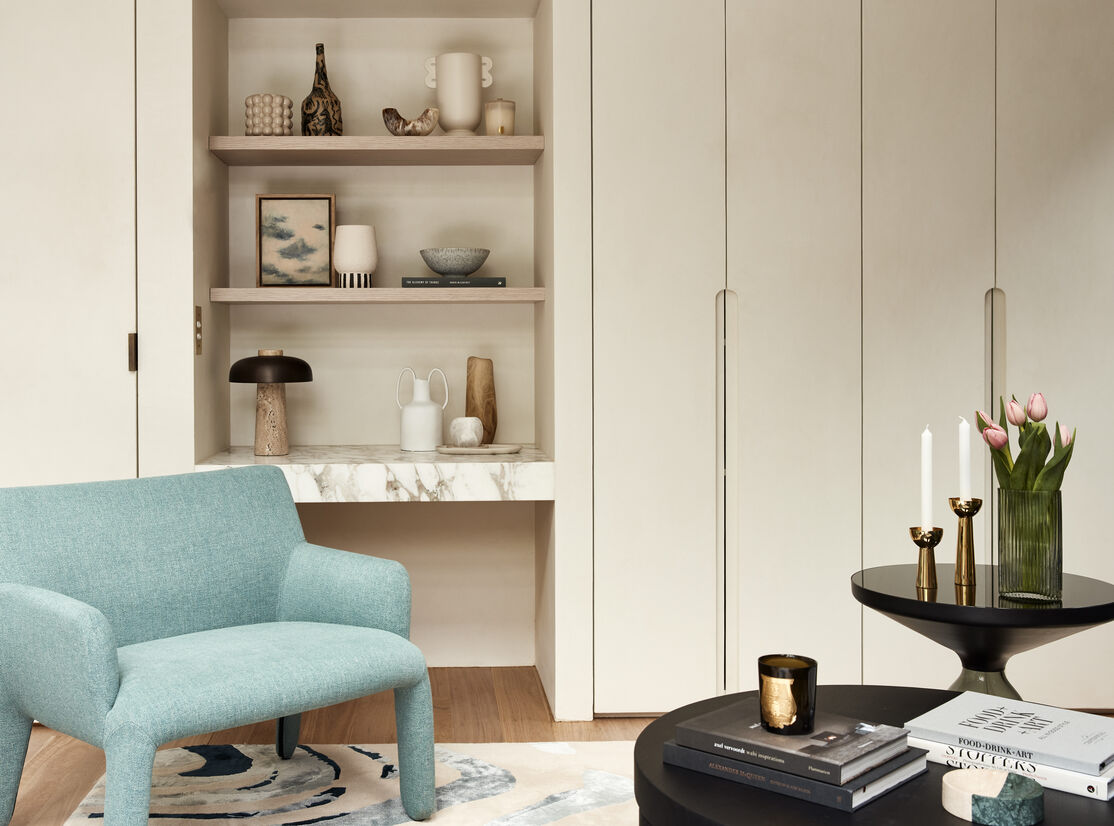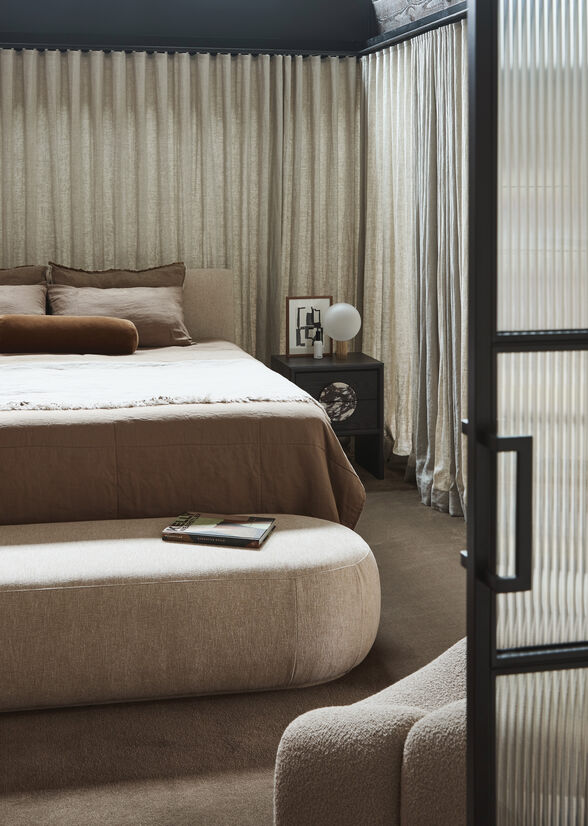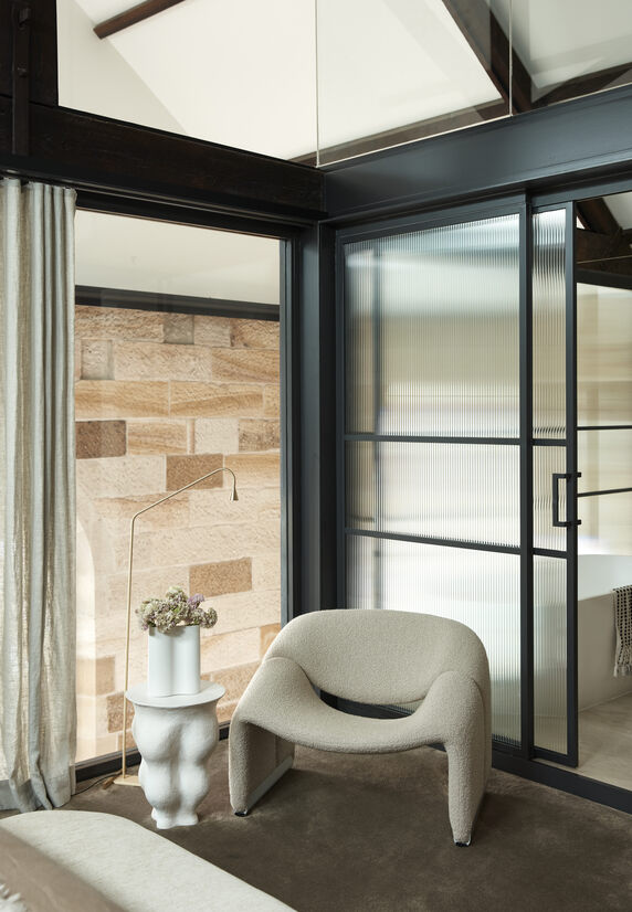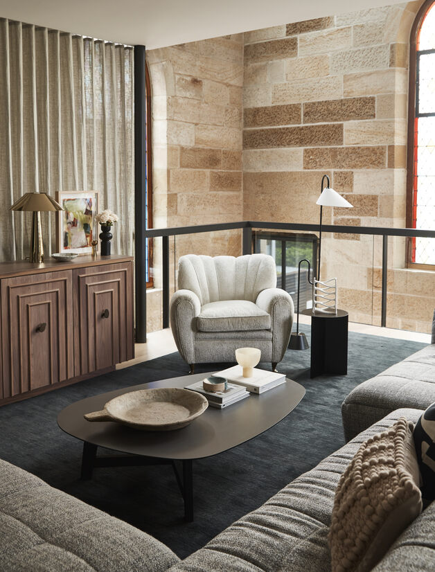 With a luxurious, hospitable presence, the lobby is a captivating introduction to the double height space. Reminiscent of a hotel lobby, one is greeted by a curved velvet lounge, touch down joinery, feature lighting and artworks, which are all key considerations of the design. Central to the floor-plan, the kitchen echoes the client’s love for hosting, where a butler’s pantry allows for easy entertaining and food preparation. Deep petrol blue hues compliment classic natural stone bench-tops and a shelf adorned with both practical and decorative objects. Integral to fostering the heritage nature and maintaining the bones of the building, considered structural changes were undertaken and executed by Rohrig Construction. Closing an internal staircase opened and maximised the living space, with specialist lighting implemented to ensure the sandstone walls are lit with indirect and discreet lighting respective of the soaring ceilings. Sensitive to the context of the site, a nod to the loft aesthetic is achieved with new finishes, furniture, lighting and joinery, bringing this full scope conversion to the height of contemporary living.