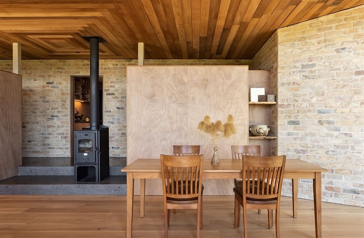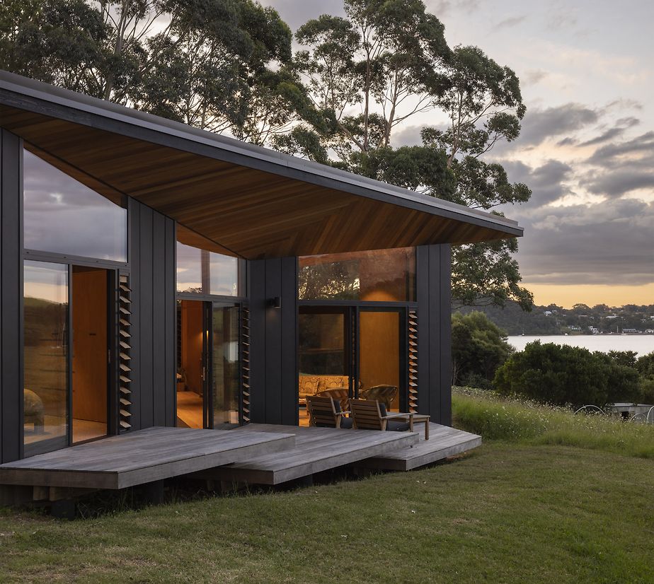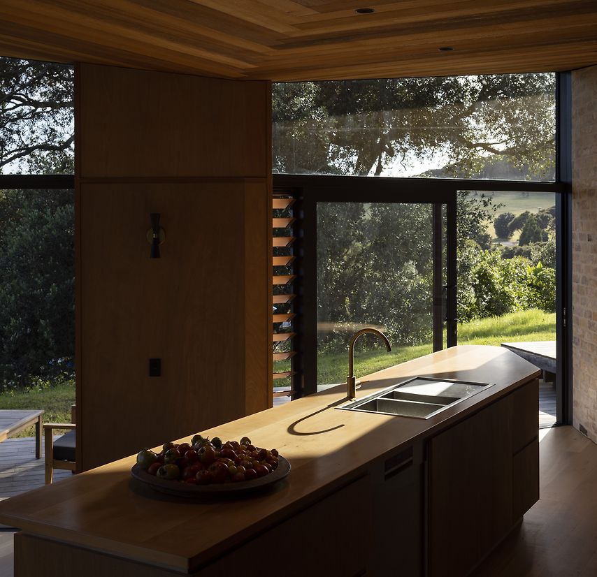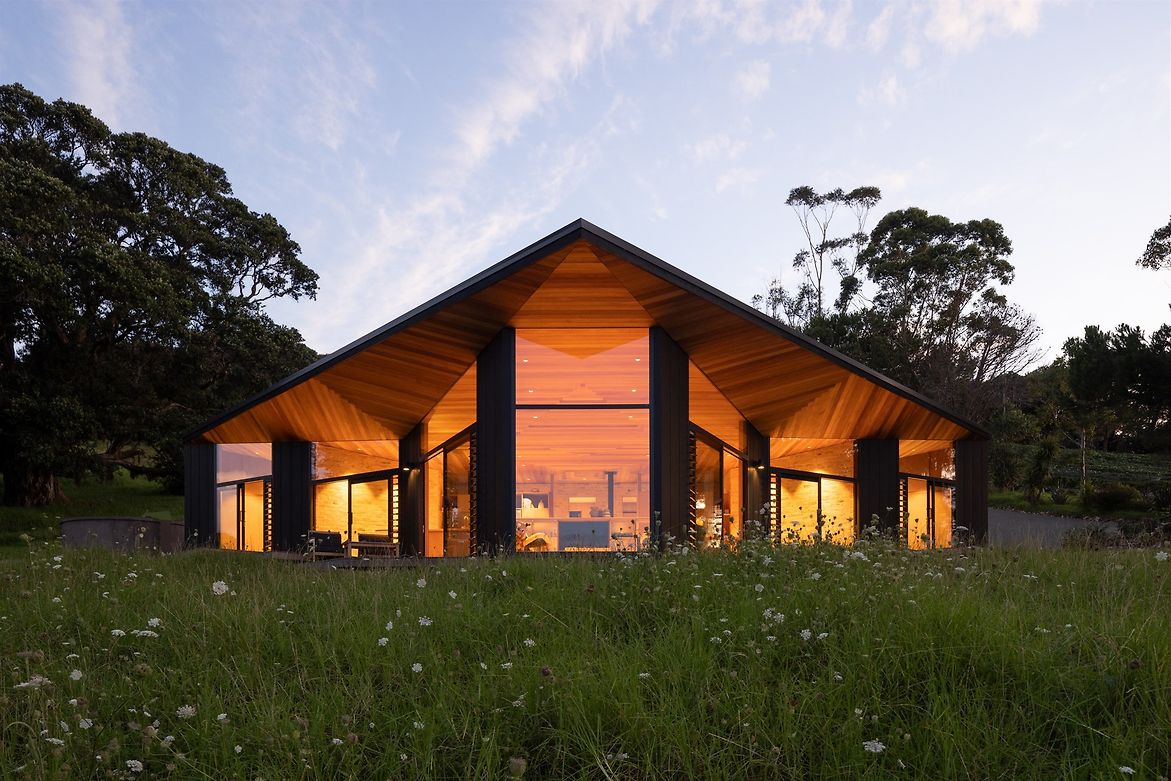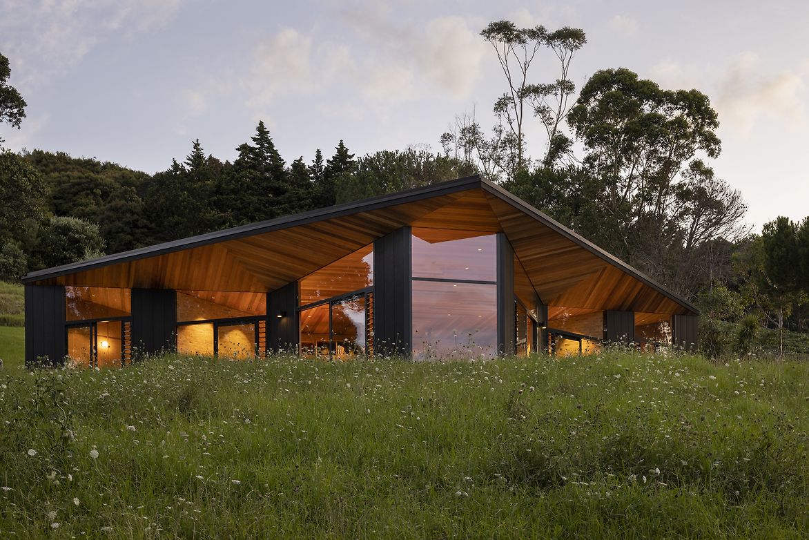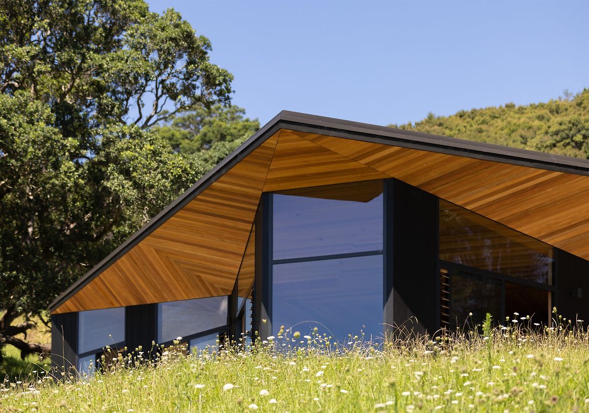 This House is located on a rural site on Waiheke Island, overlooking Anzac Bay and a mangrove swamp. The owners have lived here for many years, in a barn, with the intention of building a permanent home. There is a long, historical connection with the site. First and foremost, their brief called for a house that resembled, in some way, a bird taking flight. The owners wanted two bedrooms, one with an outlook to the two magnificent Pohutukawa on the site, the other with a water view. The living space to have both, and sun. All with direct access to the meadow. It was important they could step out from any room, directly onto the meadow. A mudroom separate to the entry was also required. We located the building site to the west of the Pohutukawa to achieve the desired views. The building form was not initially generated by the bird taking flight narrative, rather, the discovery of a seed pod from the Pohutukawa trees, found lying on the ground. The seed pod has an outer casing. This leaf like casing opens out to reveal a pod inside. When open, the outer casing creates a diagram like a compass, with points, facing north, south, east and west. An ideal scenario for this house. Living to the north, a bedroom in each east and west point, and the mudroom to the south. The floor plan was developed directly from this, and we carried the folding/opening out concept through into the roof form, which became the key uniting element for the house, and resembles, in a way, a bird taking flight. The band sawn cedar soffit, with its folding form, has a step pattern in the panelling, influenced by the overlapping feathers on a bird’s chest. Living spaces and bedrooms have northerly aspects. These are all cross ventilated. All serviced are located to the south, with minimal glazing. The house is off grid. It is 100% solar powered, collects its own water and processes its own wastewater on site.