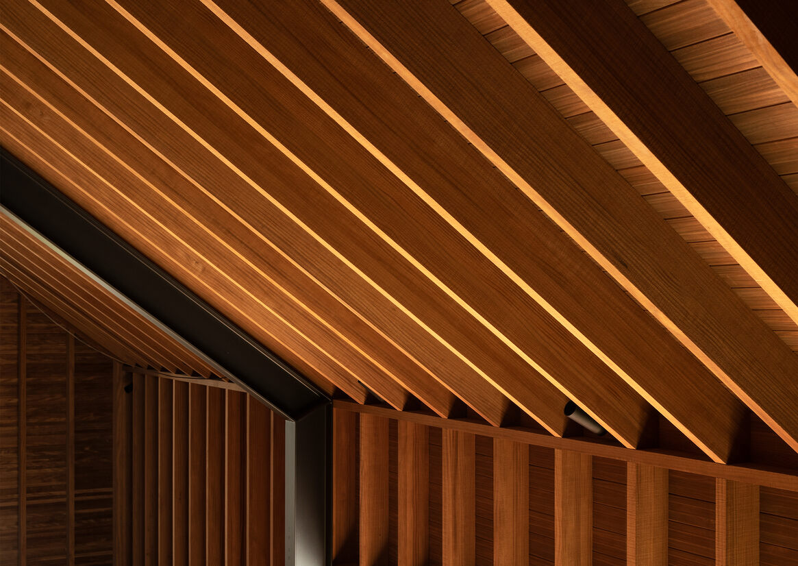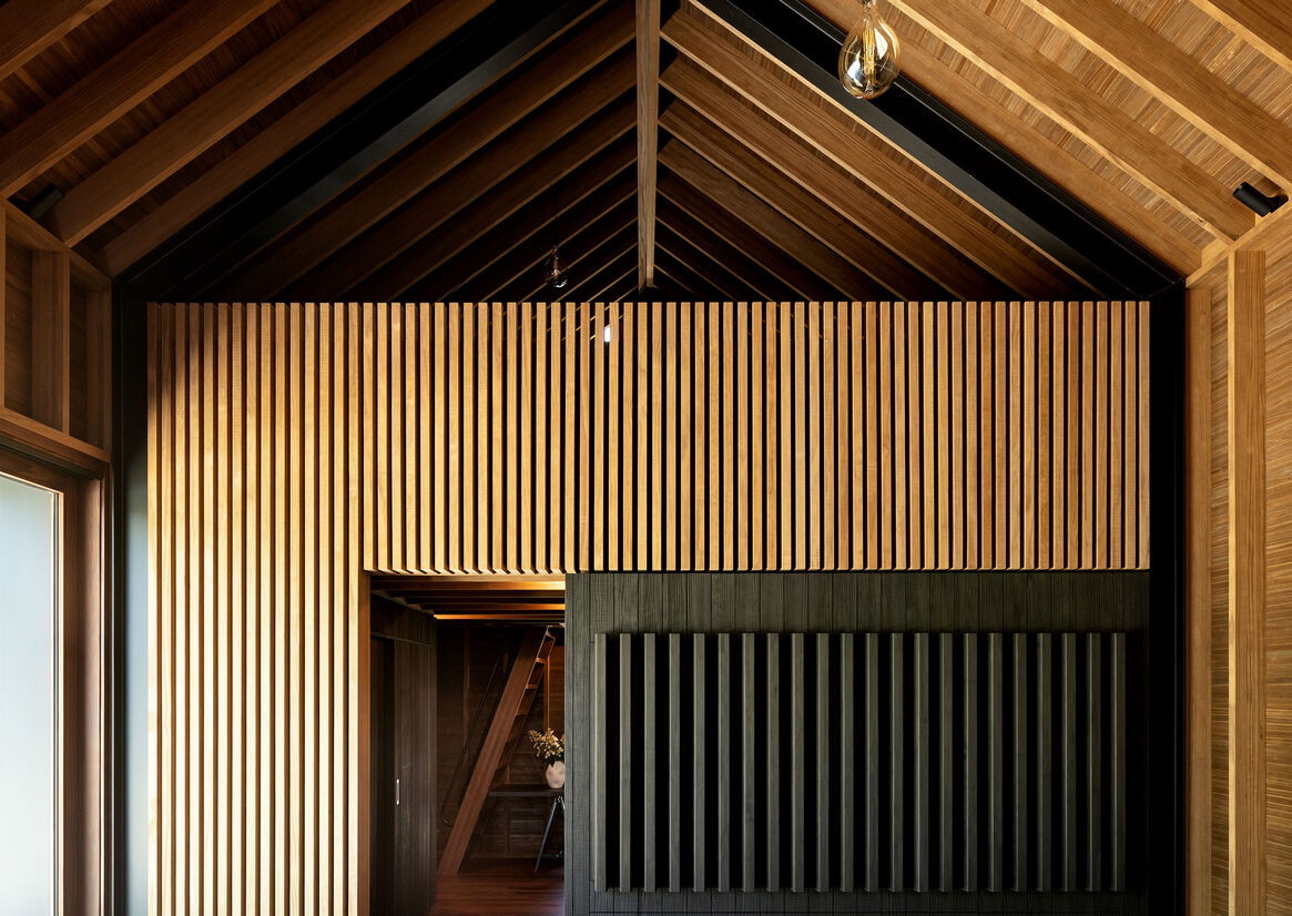 Exposed structural studs and rafters are exposed in front of tongue and grooved wall and ceiling panelling, providing shadow and depth to the wall. The trueness of the dwangless studs is a testament to the material stability of the timber, while the panelling displays the strata of the lamination and tone from the thermal modification treatment to add texture and rich tone to the space.