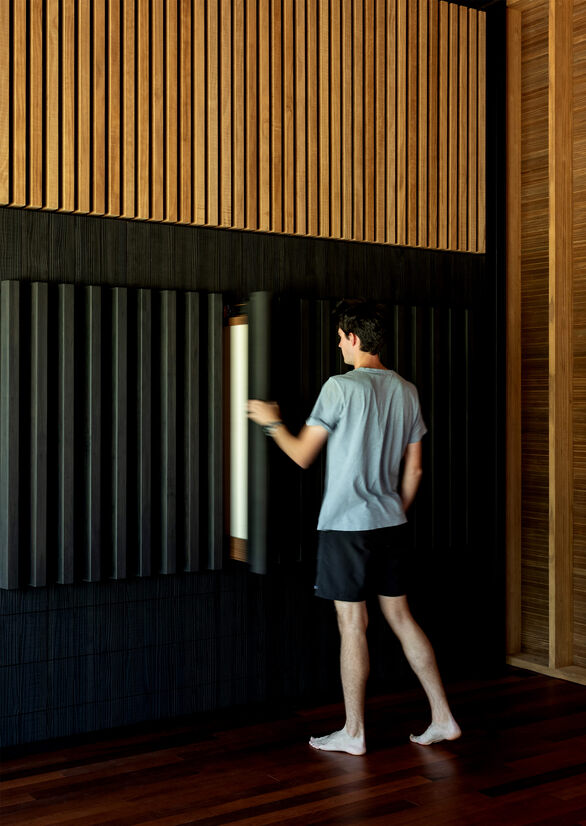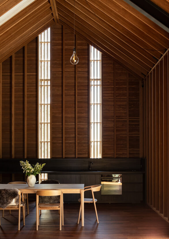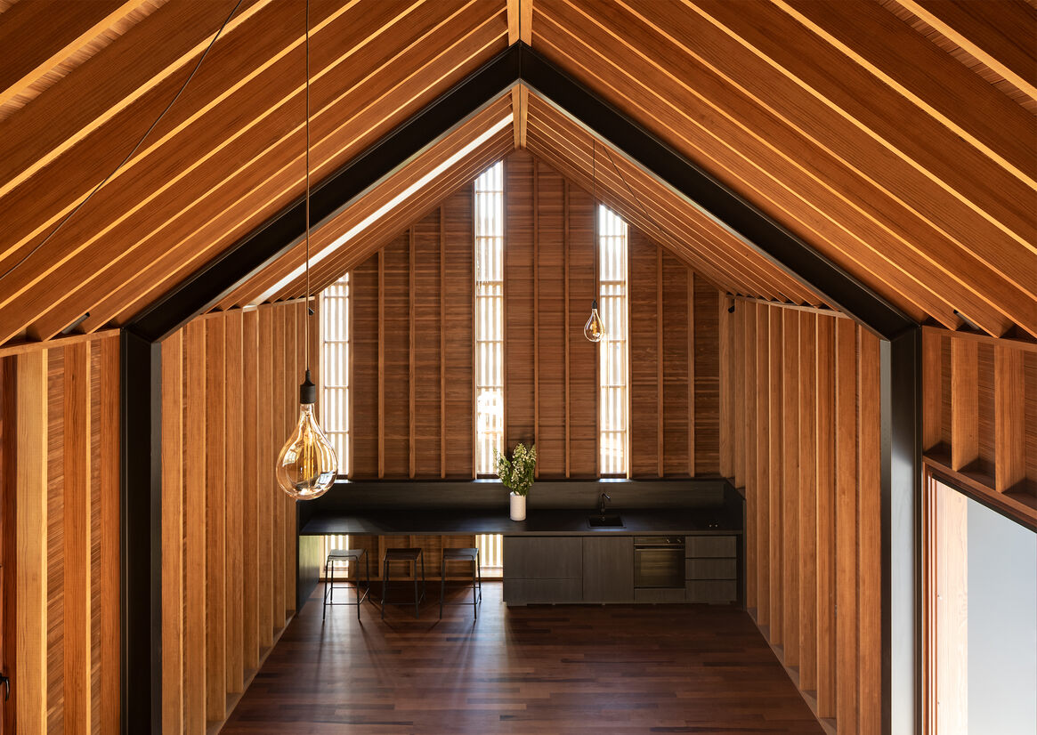 A play with light is expressed in the interior space from the tall thin slots of glass with the timber battens continuing on the outside.
