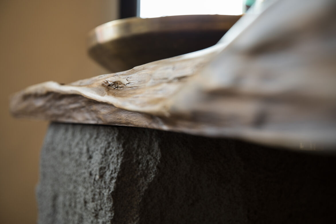 The welcome table is not a counter but a space for hosting, tasting and gift wrapping with a ceremonial basin for washing.