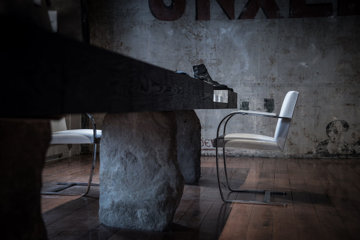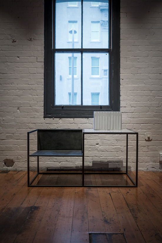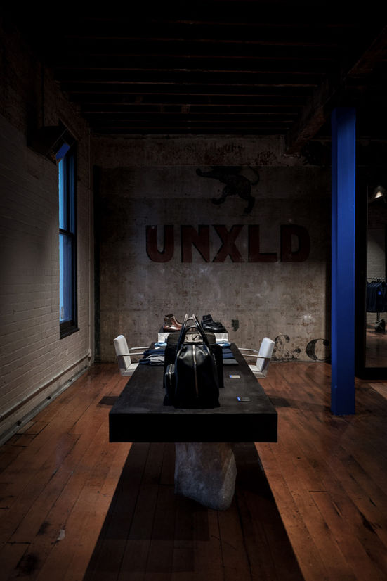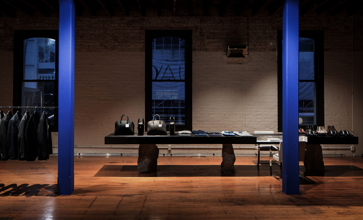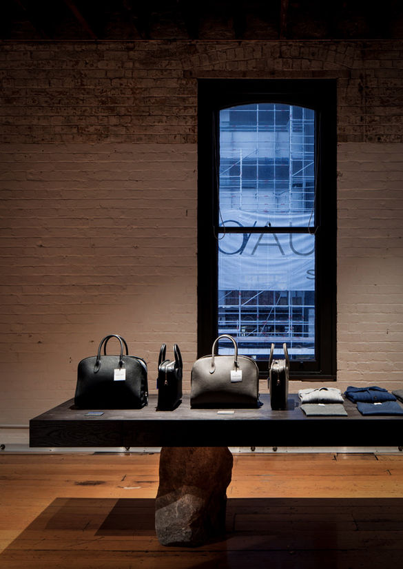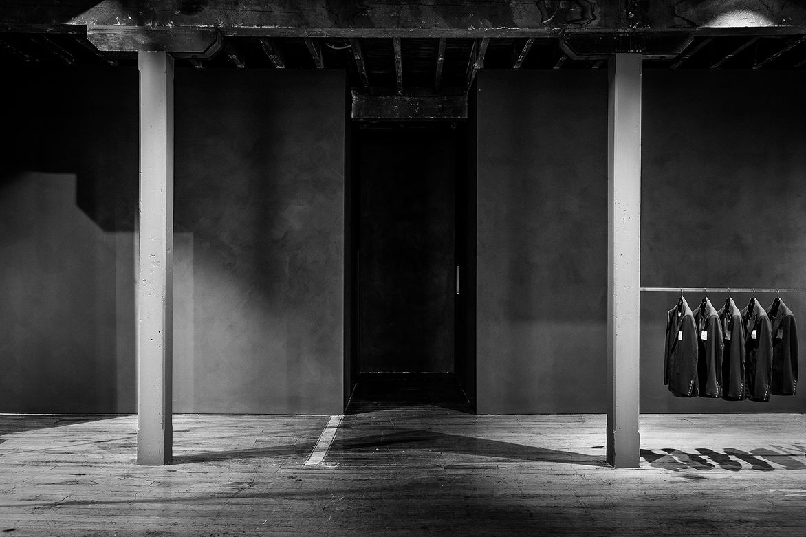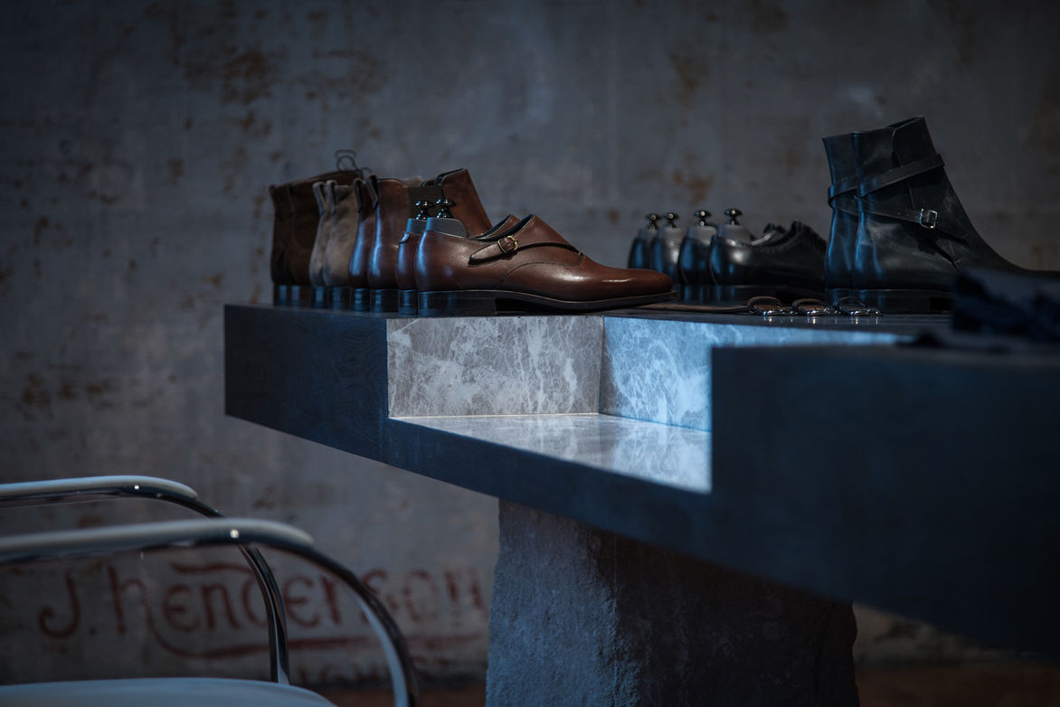 Stands on the wall stage, moody, tectonic, blend of retail and gallery like.