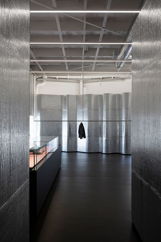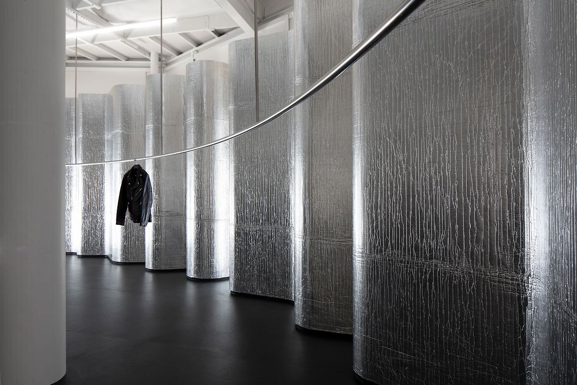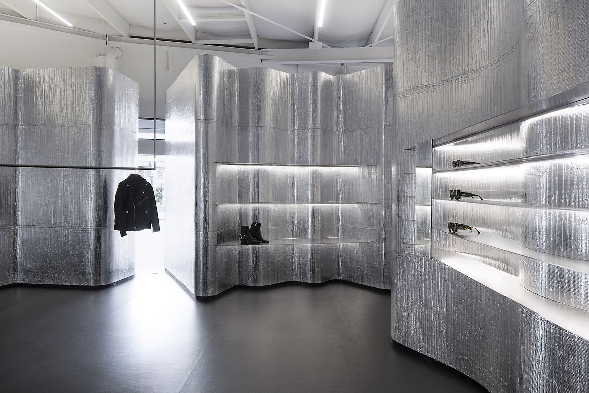 The foil’s pink foam backing inspired the paint shade selected for the fitting rooms, providing a visceral counterpoint to the black and silver finishes which dominate the interior. The bespoke display design features knife-like stainless-steel shelves that slice into the curving walls, while a sinuous ceiling-mounted garment rail arcs through the space, transforming garments into artworks.