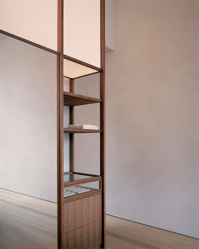Floor-to-ceiling joinery of Spotted Gum, wall coverings of coarse lime wash plaster, suspended panels of Kozo washi, reclaimed timber cabinetry, textiles of linen and wool, and a refinished floor of Victorian Ash imbue the space with an empathic lightness and sensitivity to place.