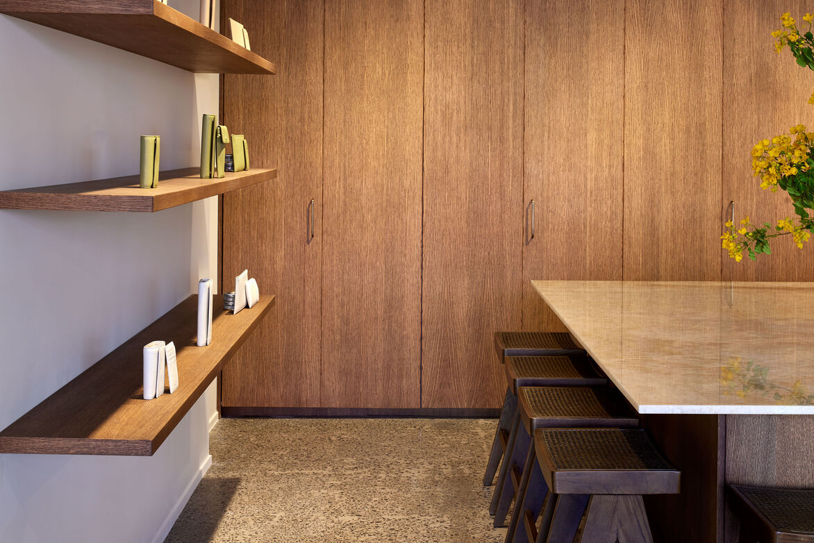 The new retail space reconfigures the existing open-plan floor plan creating a large stone-topped point of sale and timber display shelves in the front half of the store. The interior palette is based around a combination of simple geometric forms punctuated by blocks of expressive materiality – polished concrete, stained Oak, Onyx marble, Ōamaru stone, and aged brass finishes combine to create an earthy but refined atmosphere. The rear of the store offers a counterpoint and different character, embracing existing heritage brick and exposed steel structure, to create a more intimate and loft-like experience that enables Yu Mei to host private shopping events, product launches, and hosted dinners for small groups.
