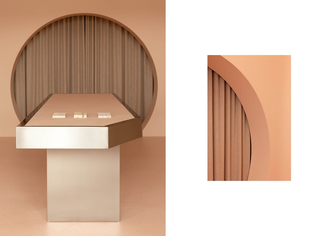 Anchored by a minimal, monotone pink palette, the space blurs the line between gallery and retail. From the oversized ear sculpture in the window to walls lined with silicone display ears, every detail invites curiosity and interaction. A central brushed aluminium and velvet table presents each piece like artwork, while blush drapes and soft zoning lead toward the in-house piercing studio.