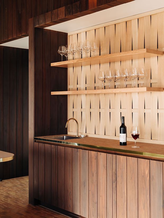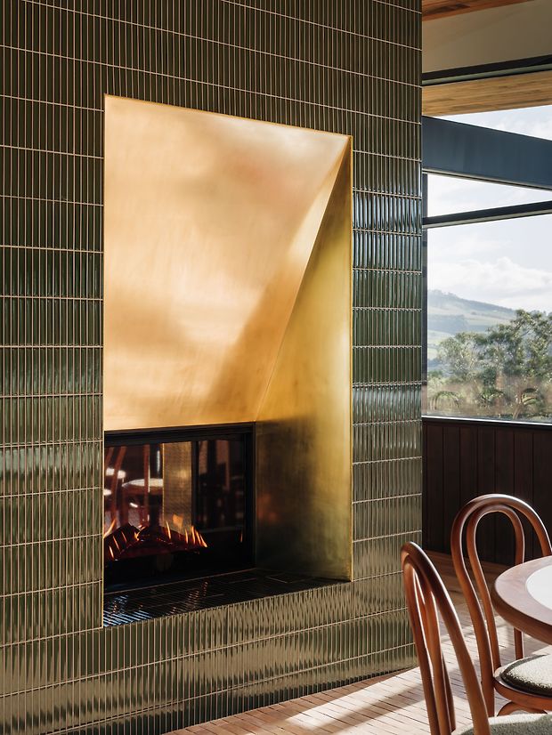 Materials have been chosen for their craftsmanship; earthy clay terracotta, natural stone, green glazed tiles, and a diversity of warm toned timbers. The heart of the space is an impactful green and brass fireplace that adds warmth and cleverly divides the space. Striking feature lighting and some unique joinery detailing adds to the inviting atmosphere that certainly encourages patrons to linger.