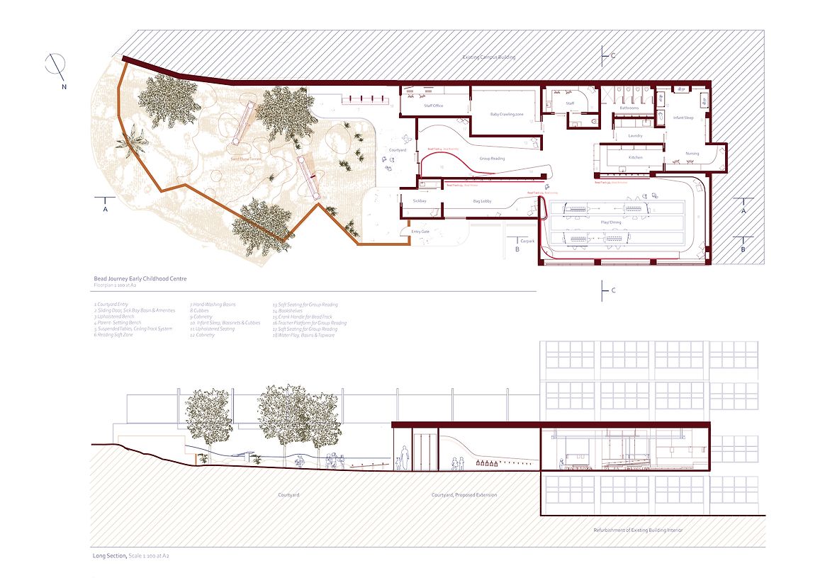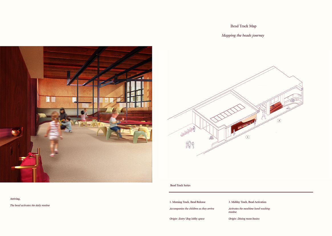Bead Journey is a design for an Early Childhood Education Centre on Wellesley Street East in Auckland's CBD. Following the closure of a previously well-loved centre, I have set out to reintegrate and restore a sense of vitality to the site. A large bronze bead rolls along timber tracks through the centre as a thoughtful and memorable gesture to the children’s learning experience by orienting them through their daily routines. The bead meets them at the arrival threshold (which can often leave children feeling unsettled). It is personified as a companion to accompany the children as they settle by rolling through each track at a child's eye-level, activating key steps in their their daily routine, triggering interactive elements. The children’s experience to settle is reflected by the motion of the bead which settles alongside fixtures and furnishings, reminding and teaching the children about their daily routines. The interior is organised around four bead tracks, each designed to map the duration of the daily routine. Children encounter a bead track in the lobby, play/dining room and the collaborative learning space. The bead is moved between the tracks by staff and employed as a teaching strategy to initiate new learning activities. The tracks soft decline orients the bead to settle alongside art supply cabinetry, hand-washing tapware and reading bookcases to invite the children to engage in collaborative learning activities. A glimpse of bronze as the bead rolls through, animating the space's inhabitance. An interplay between dark and light materiality, recessed lines and patient curves reference the gesture of the bead at alternating scales. The ribbed clay exterior alludes to the bead track that the children encounter when they arrive in the lobby space. Ceiling-suspended tables in the main play space shift along a wheel and track system to compress and decompress the play space for dining. The urban density of the courtyard is softened by the sand dune and seesaw terrain, referencing the motion of the rising and falling bead. The ceiling in both the lobby and collaborative space is contoured to accompany the bead track line and settle at the children’s height to create spatial intimacy. When the children arrive to hang their belongings, bespoke bag hooks in the lobby spring down and release the bead at durational spacings, activating the space to perform. As the bead rolls to the next hook, the sonic quality of the bronze bead alerts the children that their friend has arrived. Gestures of settling, cranking and dispensing the bead through the track invites the bead to become a performance of time, celebrating moments of the quotidian, enriching the children's everyday learning experience to arrive, settle and engage.