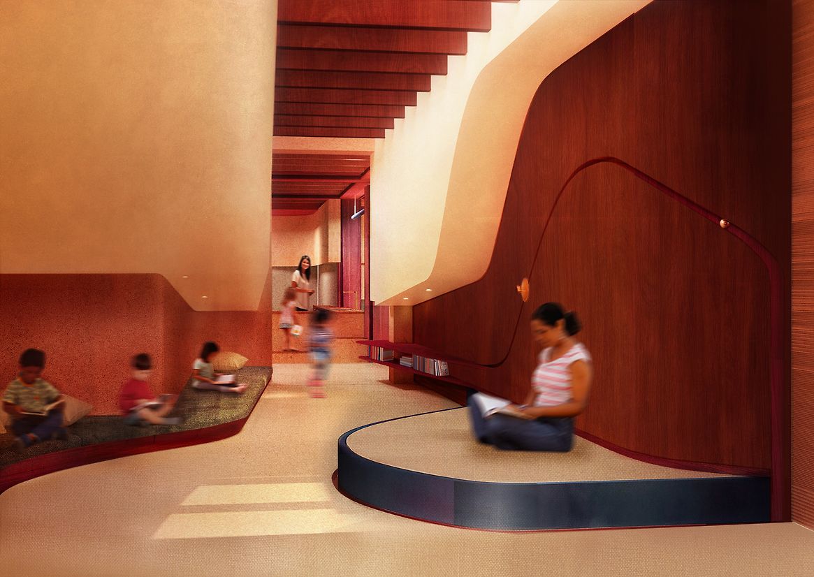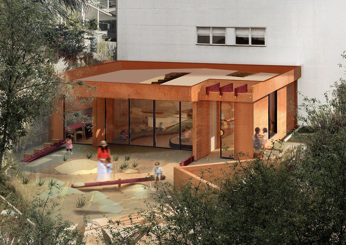 The interior is organised around four bead tracks, each designed to map the duration of the daily routine. Children encounter a bead track in the lobby, play/dining room and the collaborative learning space. The bead is moved between the tracks by staff and employed as a teaching strategy to initiate new learning activities. The tracks soft decline orients the bead to settle alongside art supply cabinetry, hand-washing tapware and reading bookcases to invite the children to engage in collaborative learning activities. A glimpse of bronze as the bead rolls through, animating the space's inhabitance. An interplay between dark and light materiality, recessed lines and patient curves reference the gesture of the bead at alternating scales. The ribbed clay exterior alludes to the bead track that the children encounter when they arrive in the lobby space. Ceiling-suspended tables in the main play space shift along a wheel and track system to compress and decompress the play space for dining. The urban density of the courtyard is softened by the sand dune and seesaw terrain, referencing the motion of the rising and falling bead.