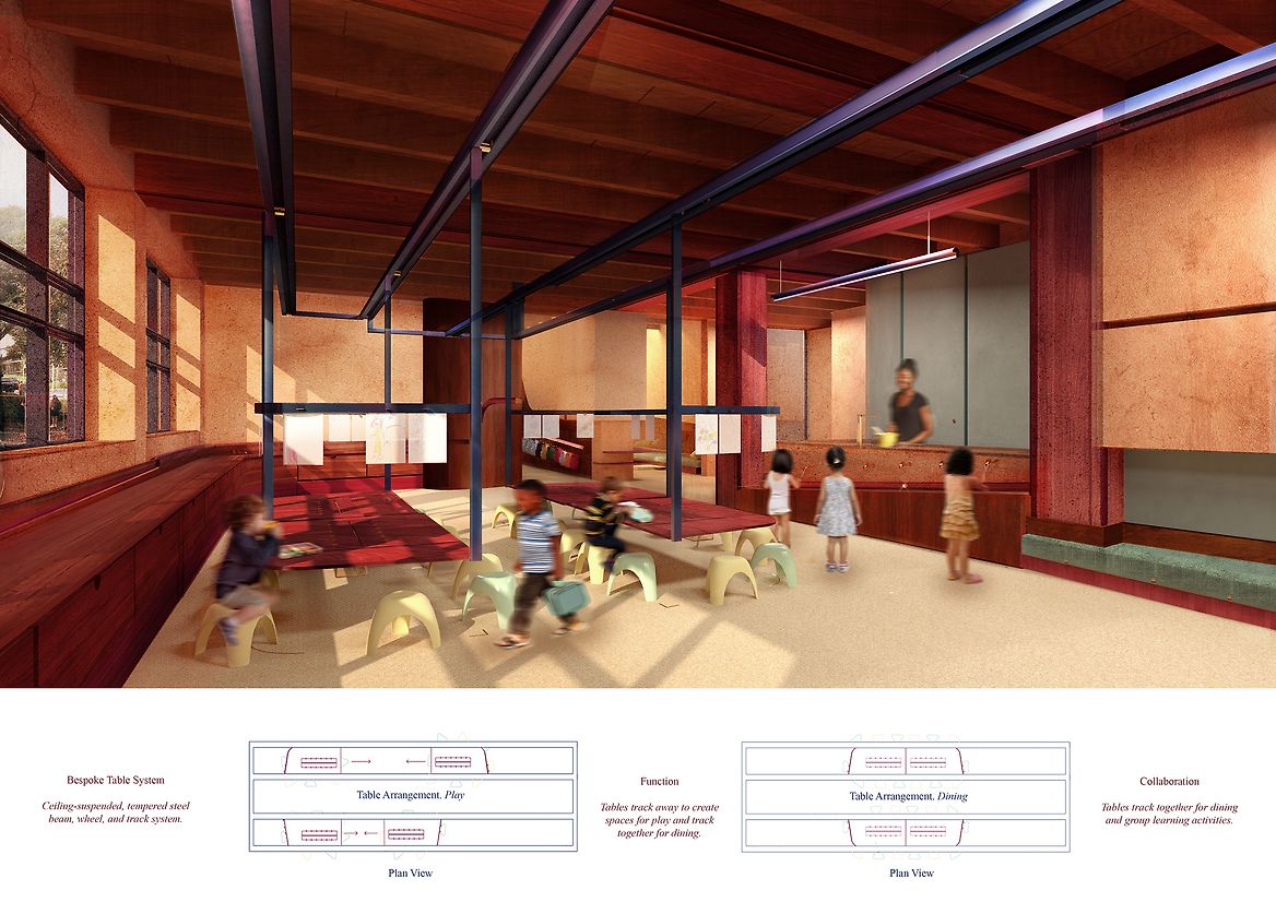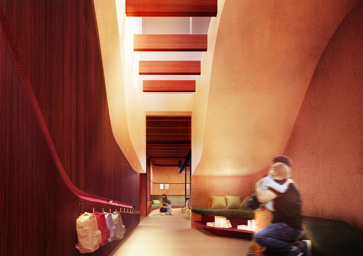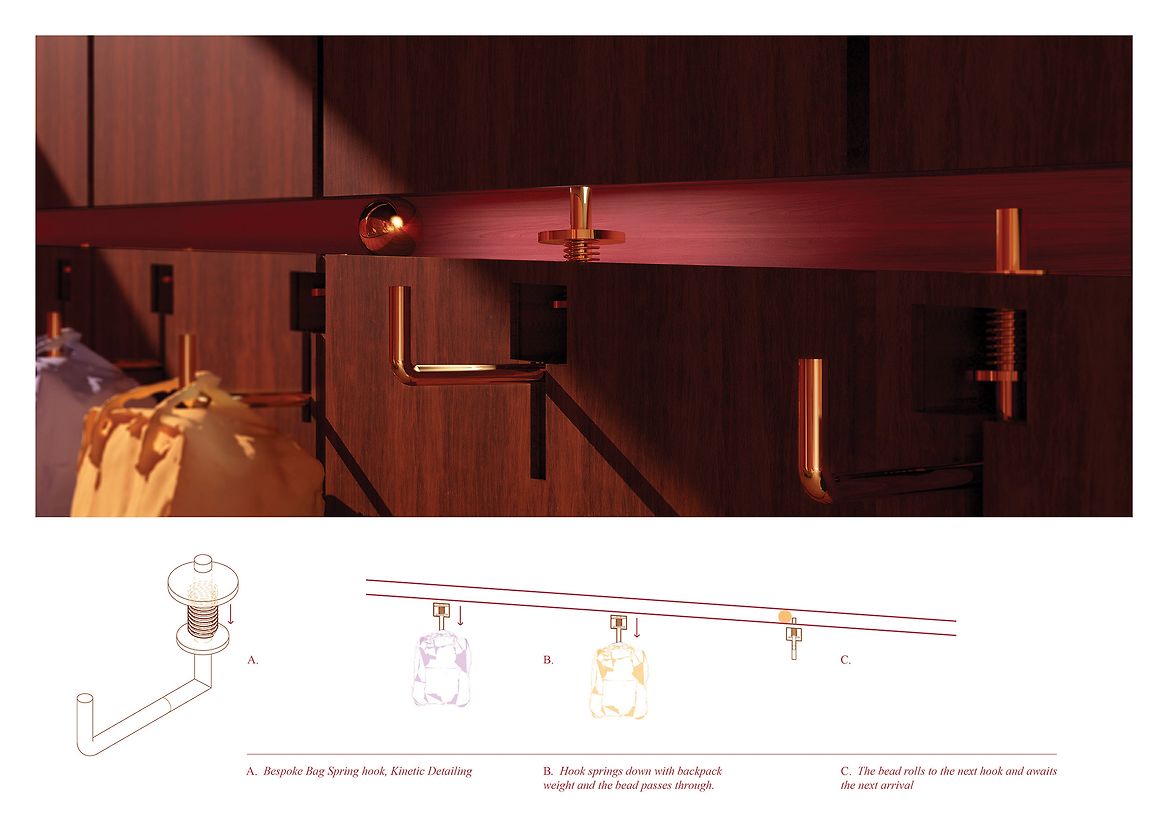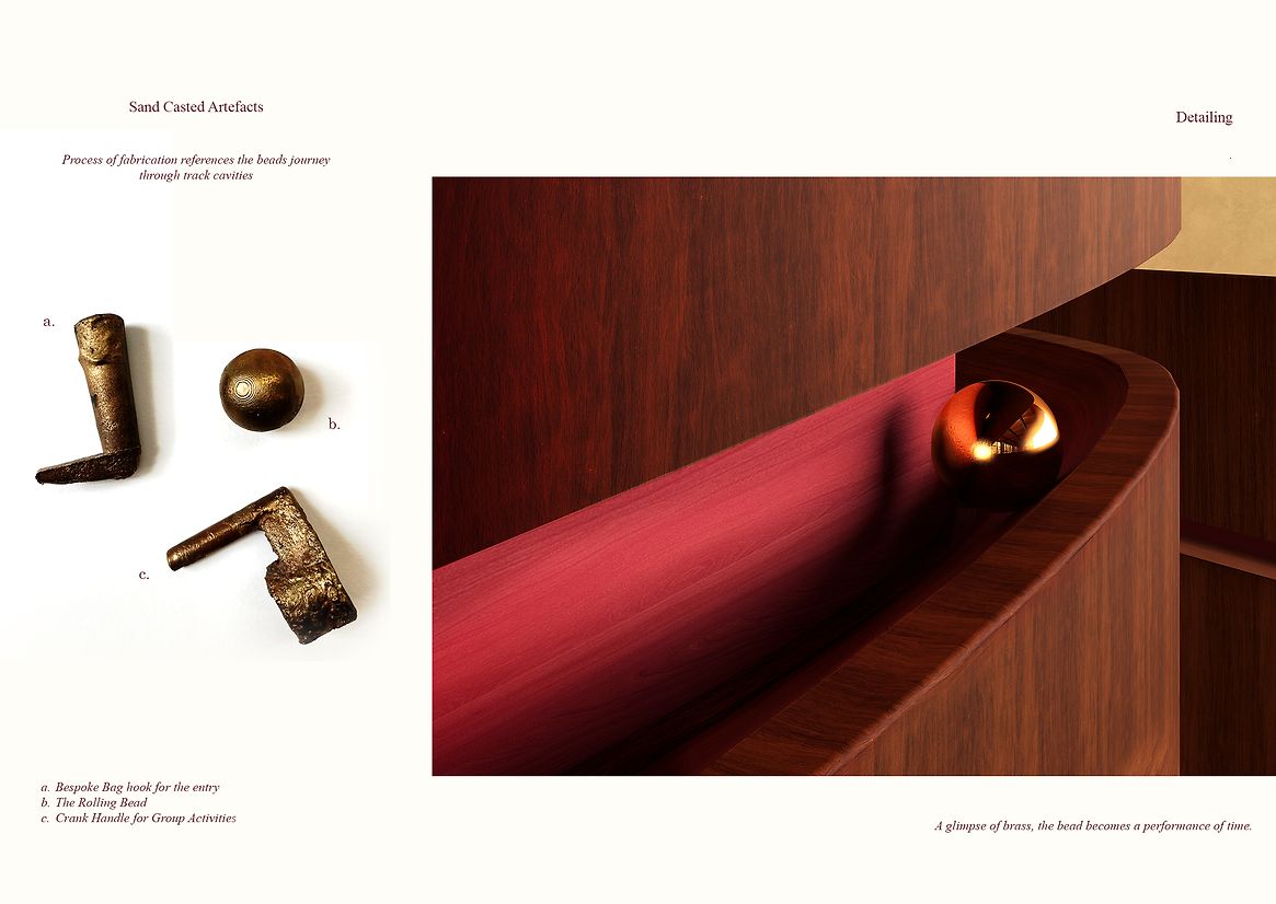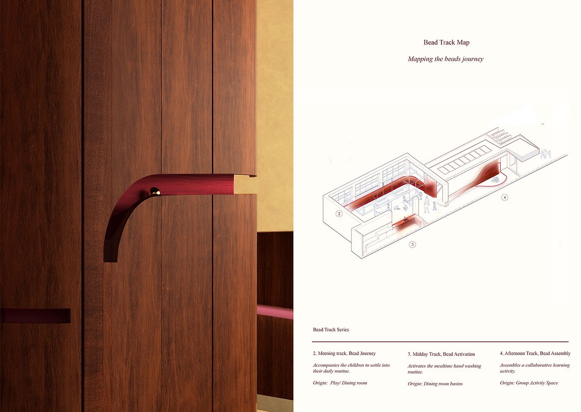 The ceiling in both the lobby and collaborative space is contoured to accompany the bead track line and settle at the children’s height to create spatial intimacy. When the children arrive to hang their belongings, bespoke bag hooks in the lobby spring down and release the bead at durational spacings, activating the space to perform. As the bead rolls to the next hook, the sonic quality of the bronze bead alerts the children that their friend has arrived. Gestures of settling, cranking and dispensing the bead through the track invites the bead to become a performance of time, celebrating moments of the quotidian, enriching the children's everyday learning experience to arrive, settle and engage.