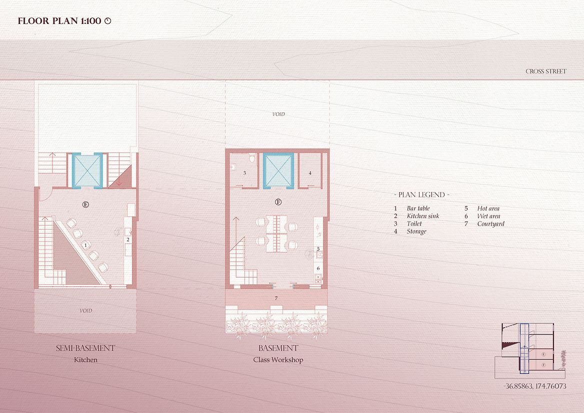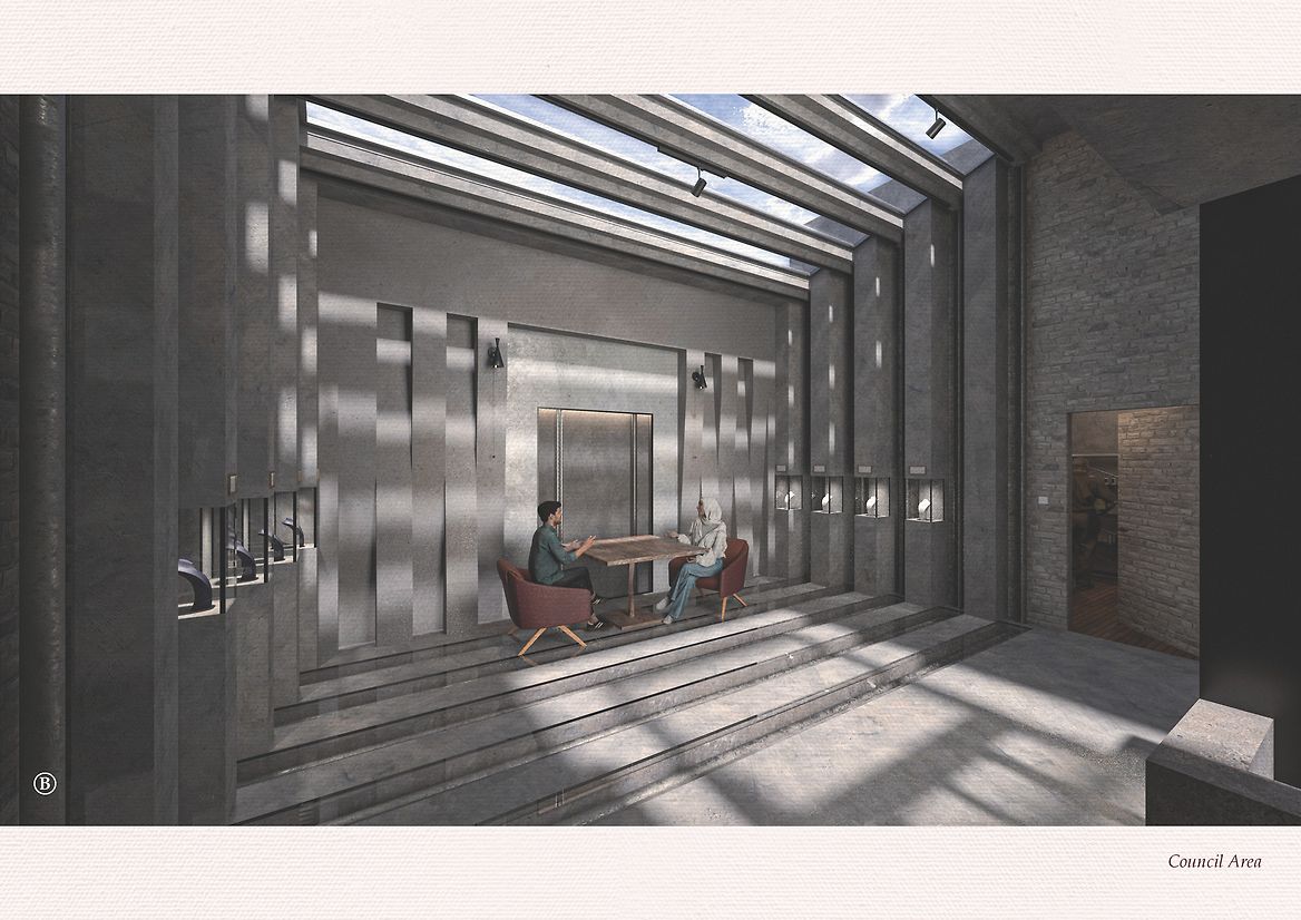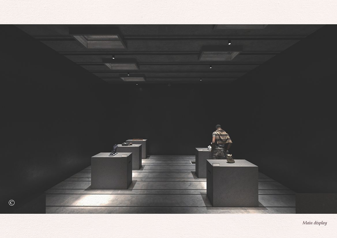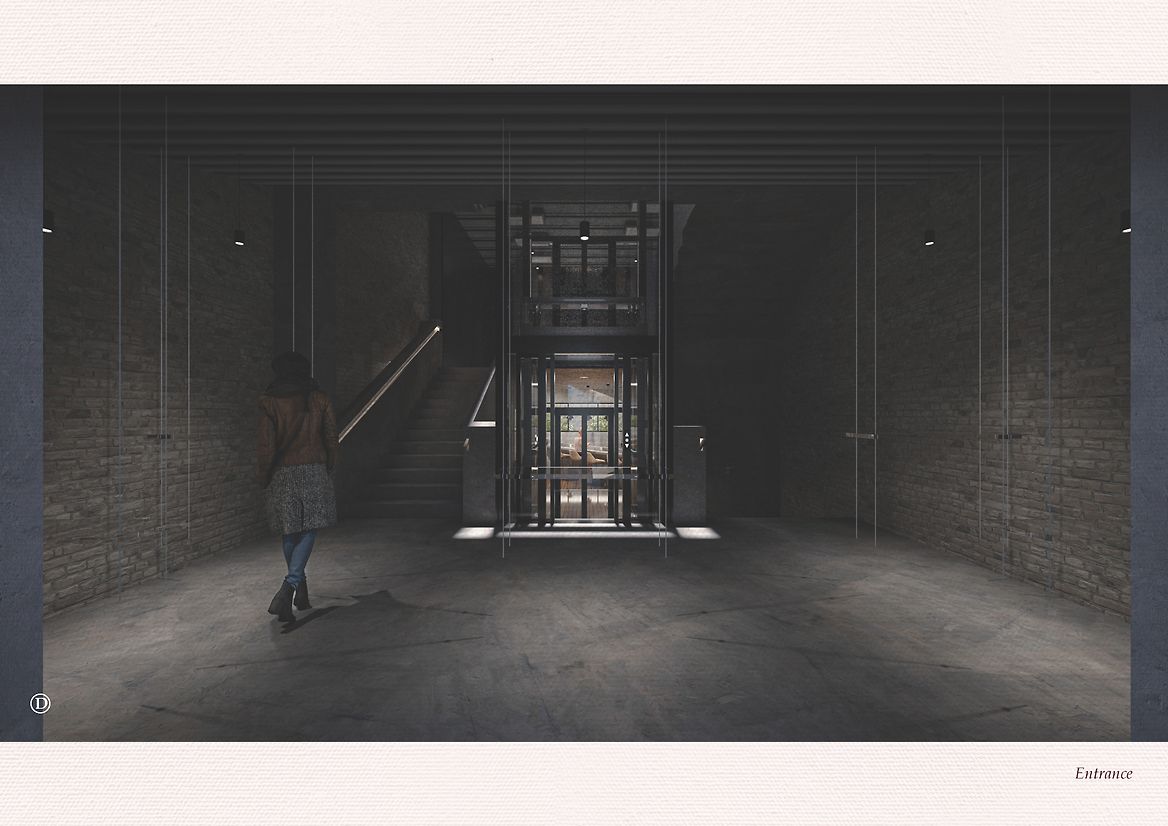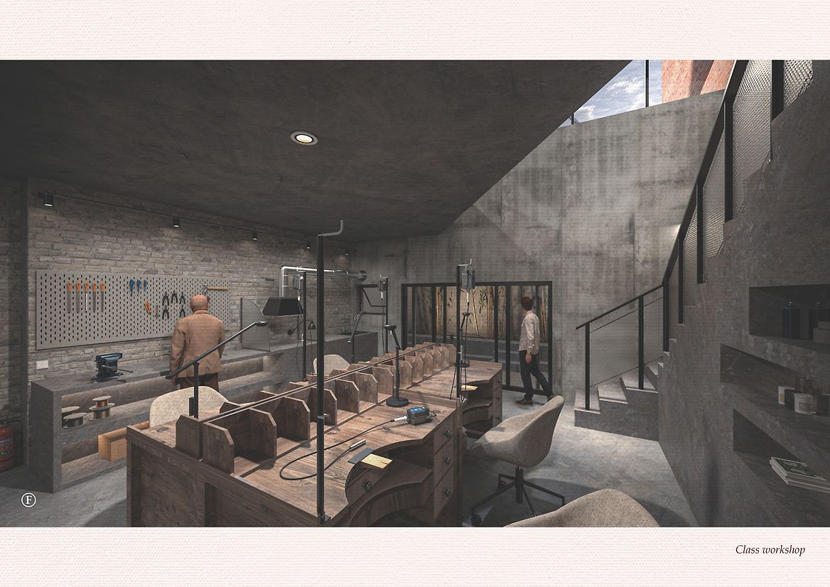 A central glass elevator and an open staircase connect these fragmented levels, allowing natural light to permeate the space. This design maximizes brightness and addresses the challenge of a blind facade, creating a sanctuary-like atmosphere inside the studio. Additionally, gaps between the elevator and stairs ensure continuous airflow, promoting better ventilation and a comfortable workspace for jewellers. Key features include two display areas with a flexible railing system for versatile jewellery showcasing. The entrance display uses a moving glass platform for delicate pieces, while the first-floor display features a moving concrete platform for larger items. The studio's minimalist, concrete-based interior emphasizes structural elements and highlights the jewellery itself.