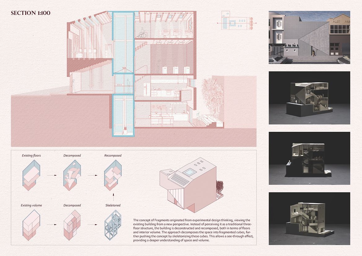 The studio's design reflects the transformative process of jewellery-making, involving decomposition and recomposition. The building has been decomposed and recomposed: originally a three-level building, Fragments now has five split levels. It is inspired by Japanese Metabolism and Brutalism, with each floor functioning as a distinct module while contributing to the overall unity.