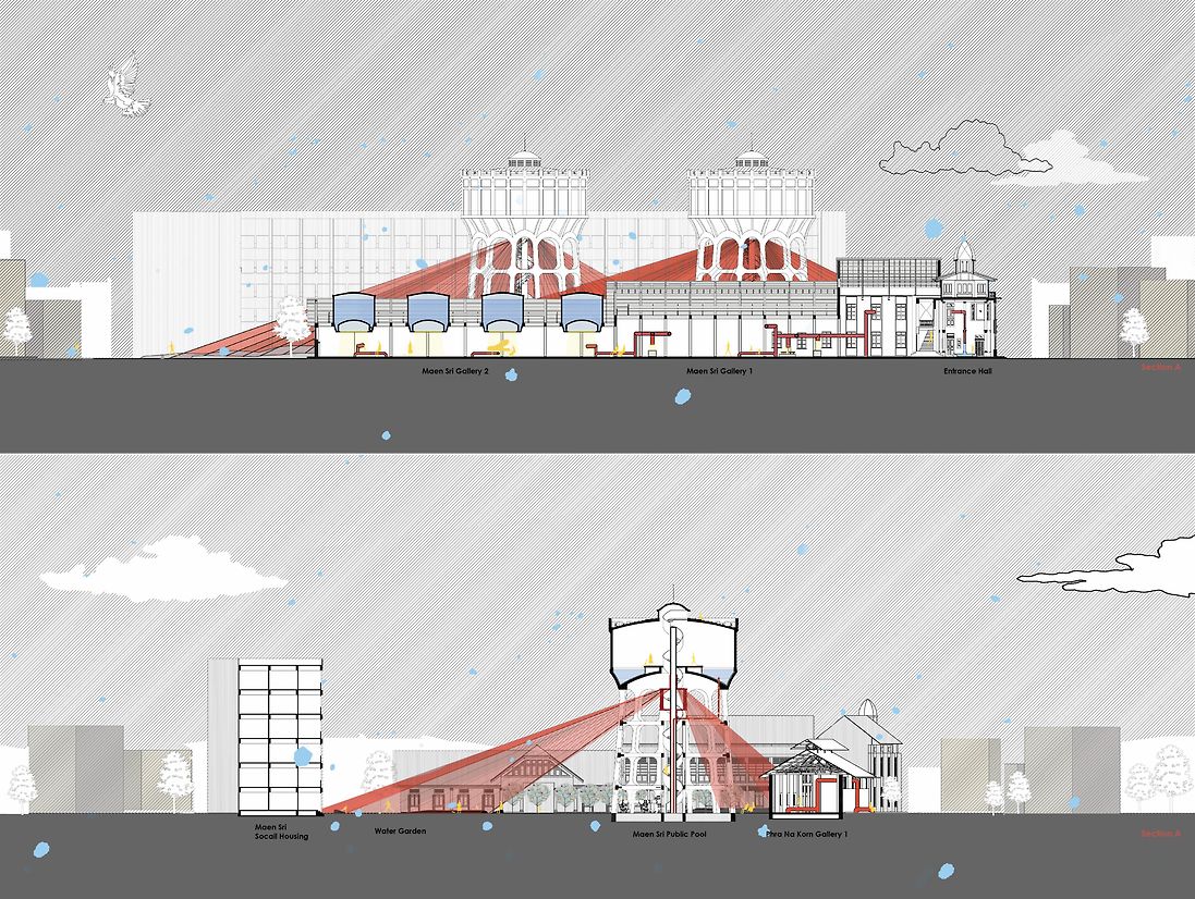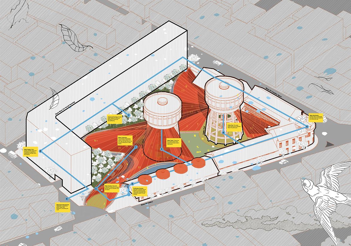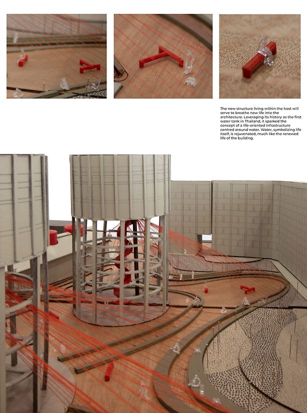 The proposed design envisions utilizing the water tower's structure as a central element for sustaining life. By attaching a polyester mesh fabric to the tower, the system can collect rain, harvest fog, and capture dew naturally, without electrical power. This existing land should provide public space and improve environmental well-being. The design proposes a water infrastructure that is designed to address the challenges in Thailand, which still struggles to have access to clean drinking water and celebrates the resurgence of the water tower, serving once again as a vital water-storage.