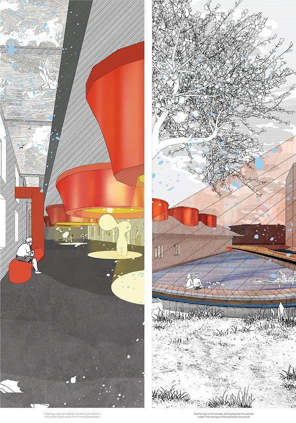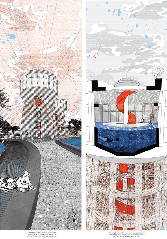 Nowadays, everywhere we walk, we can see abandoned buildings. Some have undergone repairs and repurposing efforts; some property owners neglect maintenance, leading to decay, while others opt for demolition to pave the way for new developments. There are many ways to reuse the buildings. The term 'Parasite architecture' is seen as a relationship between the new structures attached to the existing buildings to use the benefits of their structure, which are seen negatively. However, the parasite inherently exploits its host structure; it ensures the continuation of the host. It opposes destruction. This parasite approach seeks to maintain the essence of the original while accommodating new functionalities. It strives to breathe new life into the old while making room for new things to happen. However, despite the parasites living in the existing buildings, they live in abandoned buildings instead. This creative practice research explores parasitic architecture's potential to breathe new life into abandoned buildings once again. Silo Park in Auckland, repurposed from a cement tower into an exhibition space, it reminded me of a place in Bangkok, known as the Maen Sri Waterworks. These towers share a similar narrative, situated in different locations. Both once served their respective urban areas but have languished in abandonment. I began to wonder how, like Silo Park, Maen Sri could take on a second life without losing its original character. Applying the notion of the parasite to the site involves utilising the structure of the water tower as a central element for sustaining life. This is achieved by polyester meshed fabric that attaches to the tower's structure. This system collects rain, harvests fog, and captures dew, operating solely through natural processes such as gravity, condensation, and evaporation without the need for electrical power. I tested by suspending a polyester mesh in an outdoor space overnight. In the morning, water droplets adhered to the mesh and began accumulating into larger droplets, then dropped into the bucket to store the water. The proposed design envisions utilizing the water tower's structure as a central element for sustaining life. By attaching a polyester mesh fabric to the tower, the system can collect rain, harvest fog, and capture dew naturally, without electrical power. This existing land should provide public space and improve environmental well-being. The design proposes a water infrastructure that is designed to address the challenges in Thailand, which still struggles to have access to clean drinking water and celebrates the resurgence of the water tower, serving once again as a vital water-storage.