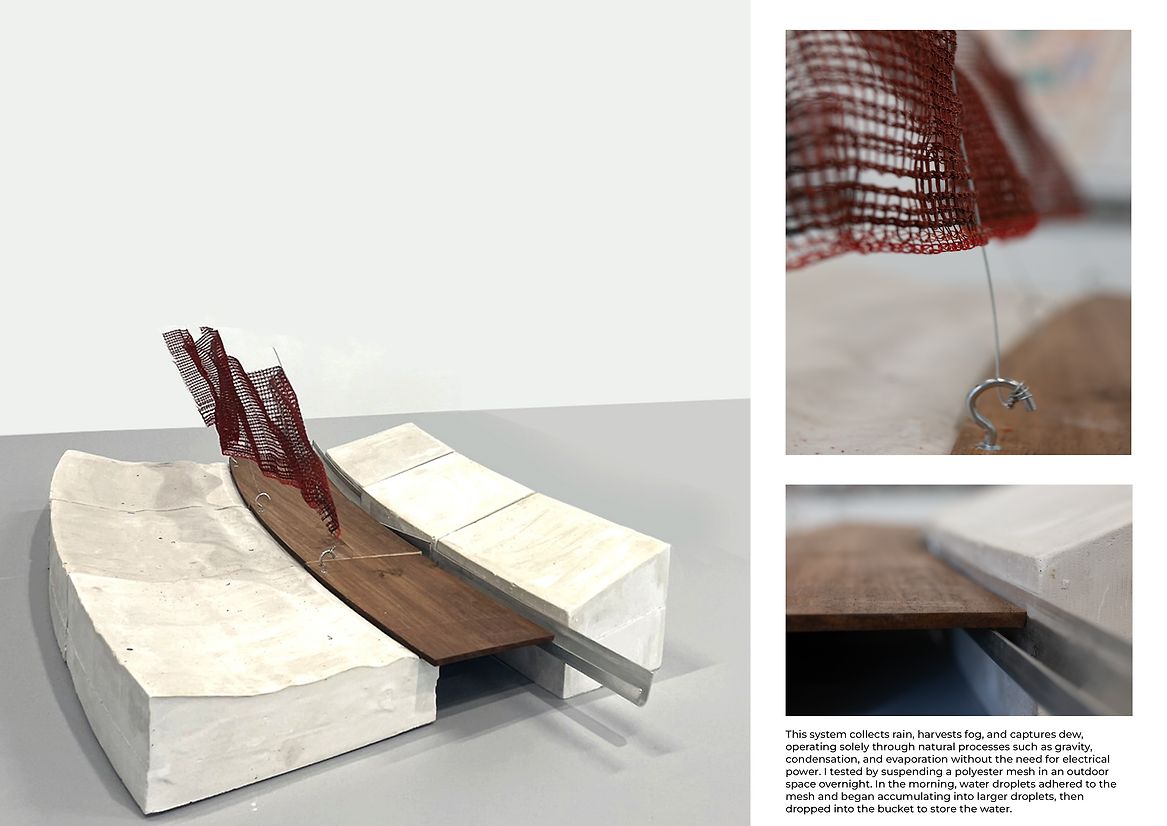 Applying the notion of the parasite to the site involves utilising the structure of the water tower as a central element for sustaining life. This is achieved by polyester meshed fabric that attaches to the tower's structure. This system collects rain, harvests fog, and captures dew, operating solely through natural processes such as gravity, condensation, and evaporation without the need for electrical power. I tested by suspending a polyester mesh in an outdoor space overnight. In the morning, water droplets adhered to the mesh and began accumulating into larger droplets, then dropped into the bucket to store the water.