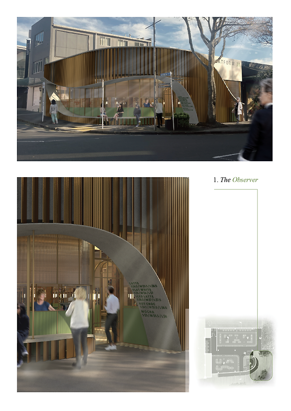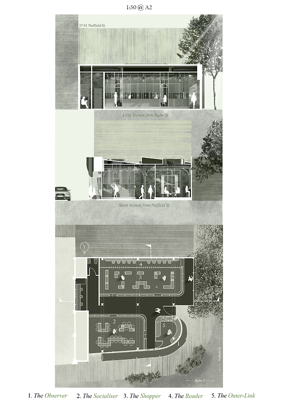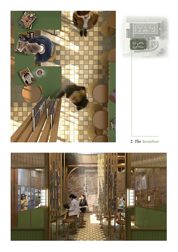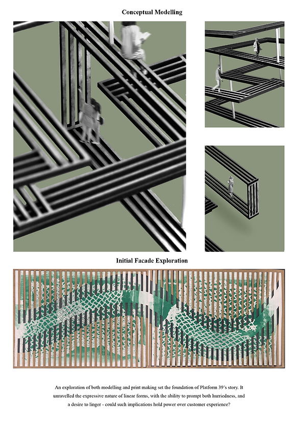 Newmarket train-station, a pivotal junction at the heart of the suburb, continued this study of linearity in the context of human nature. It prompted the idea of vastly different journeys intersecting fleetingly, some racing from one train to the next, and others simply meandering too nowhere at all. Rather than flattening its audience into a single type, Platform 39 identifies 4 key demographics through the metric of time, creating a coexistence that may not naturally occur in the haste of life. To capture this, the Inner-Link establishes itself as the primary furnishing of the space - an unending structure of parallel timber beams, housing a plethora of comics and inhabitable surfaces. While customers may choose to activate it within their preferred part of the space, they’re unbeknownst to their indirect contact with someone seeking a contrasting retail experience. The beams that comprise this network are representative of these demographics becoming paralled, within and around the space, with the 5th established as what binds them together.
