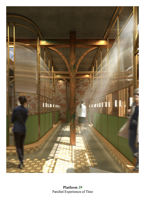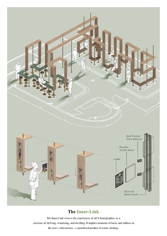 one train to the next, and others simply meandering too nowhere at all. Rather than flattening its audience into a single type, Platform 39 identifies 4 key demographics through the metric of time, creating a coexistence that may not naturally occur in the haste of life. To capture this, the Inner-Link establishes itself as the primary furnishing of the space - an unending structure of parallel timber beams, housing a plethora of comics and inhabitable surfaces. While customers may choose to activate it within their preferred part of the space, they’re unbeknownst to their indirect contact with someone seeking a contrasting retail experience. The beams that comprise this network are representative of these
