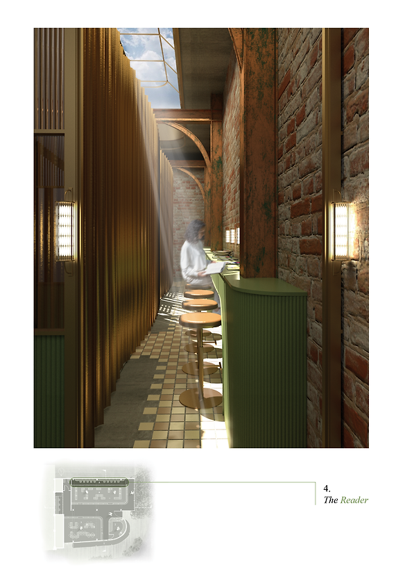 The Reader: Fully detached from the Inner Link, this space is its own world. Here, time is suspended, readers are immersed, disconnected from the spatial and social timelines around them.