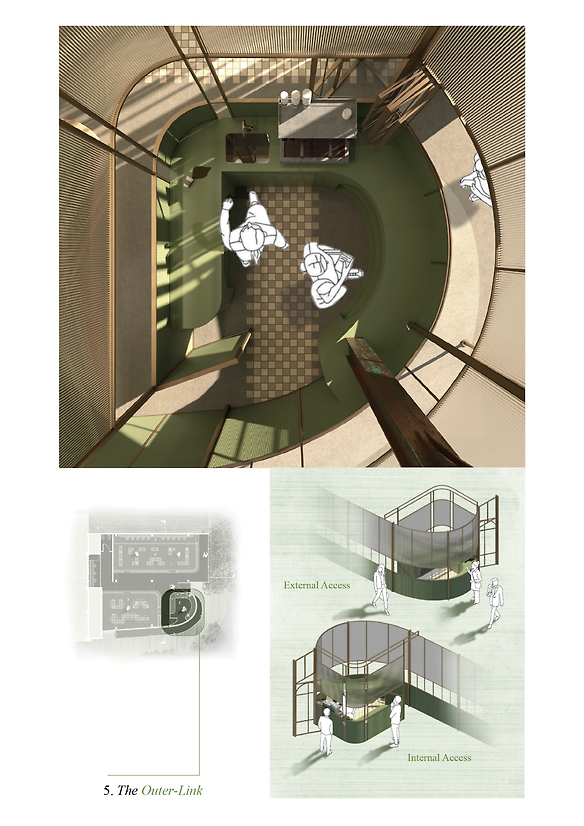 The Kiosk (The Outer Link): Positioned as the relative to the Inner-Link, the Outer-Link Kiosk connects inside and out. It draws in the passerby