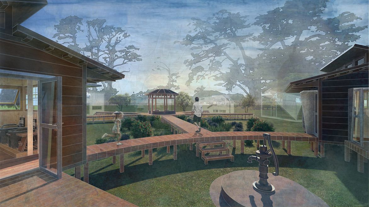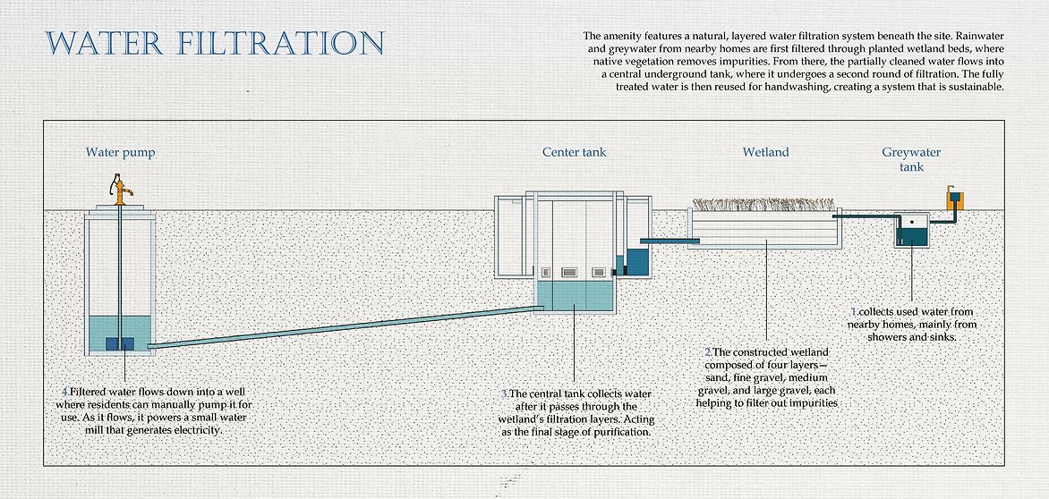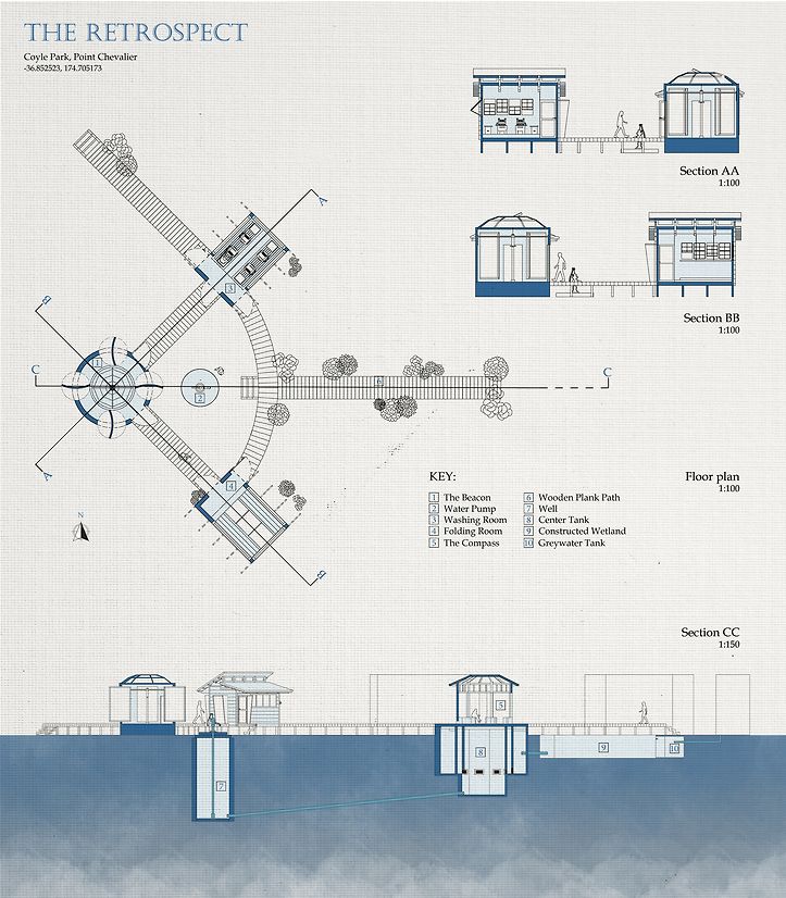 This laundromat harnesses the prevailing wind to dry clothes. Rainwater is also collected from the site along with wastewater from residents, which is filtered through wetland plants for reuse. Retrospect, "in looking back and contemplating the past", means to reawaken the lost tradition of handwashing and our ability to connect with others during what seems to be an arduous task.