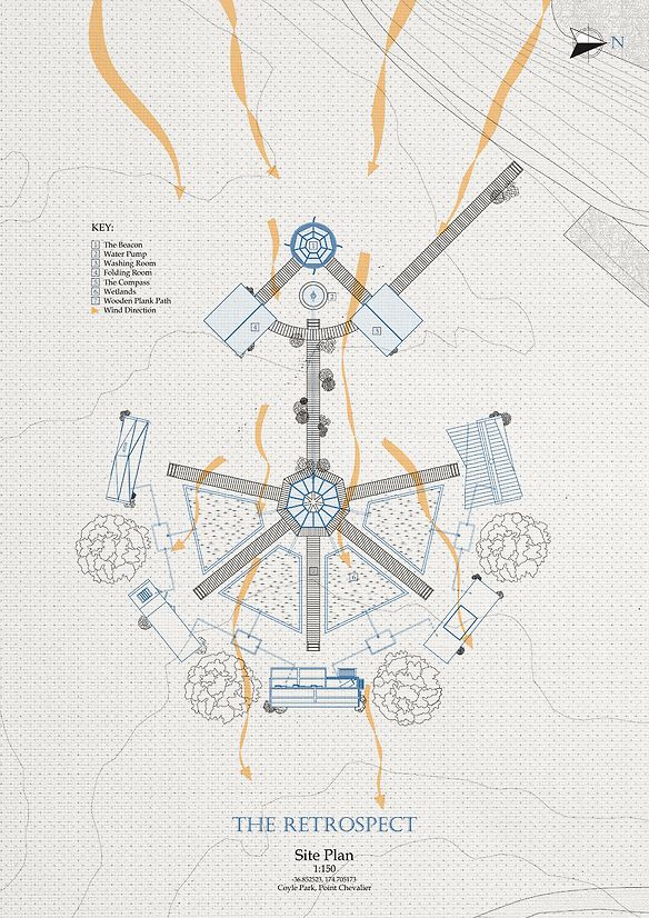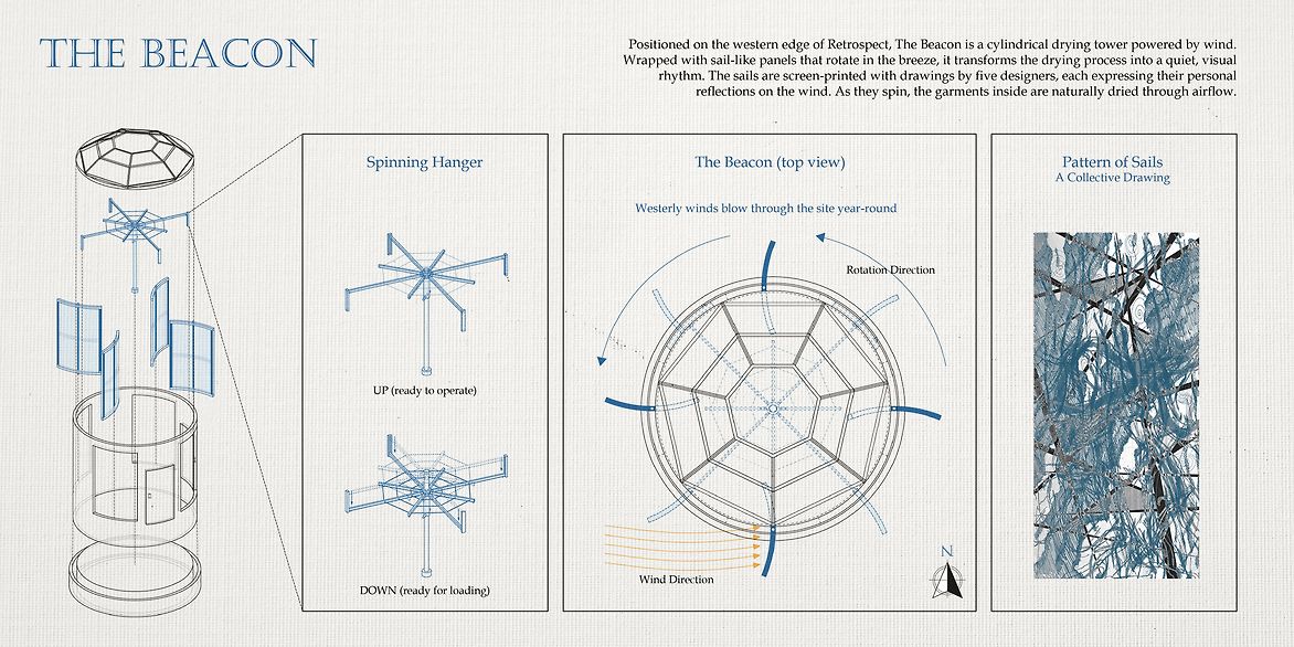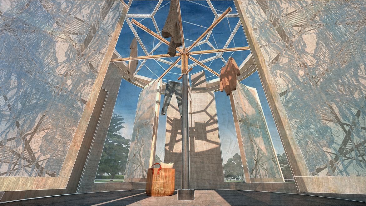 "Retrospect" is separated into three stages: washing, drying and folding, allowing the user to experience a sense of community that is bonded by an appreciation of this daily chore. The first stage commences once the user steps into the laundromat, equipped with bespoke basins that enable people to scrub and wash their garments with no worry for their tender hands. The second stage is the beacon of the amenity, an attention-grabbing carousel-like dryer. Propelled by the wind, the bespoke canvas sails lining the exterior walls rotate. As the walls spin, garments also spin within the space, accelerating drying times. These sails are screen printed with a design co-produced by the team and renders abstract expressions of wind patterns found on the site. The final, folding stage, allows people to enhance both their folding and communication skills by fostering relationship building through the patience of folding clothes in a shared space that allows human connection.