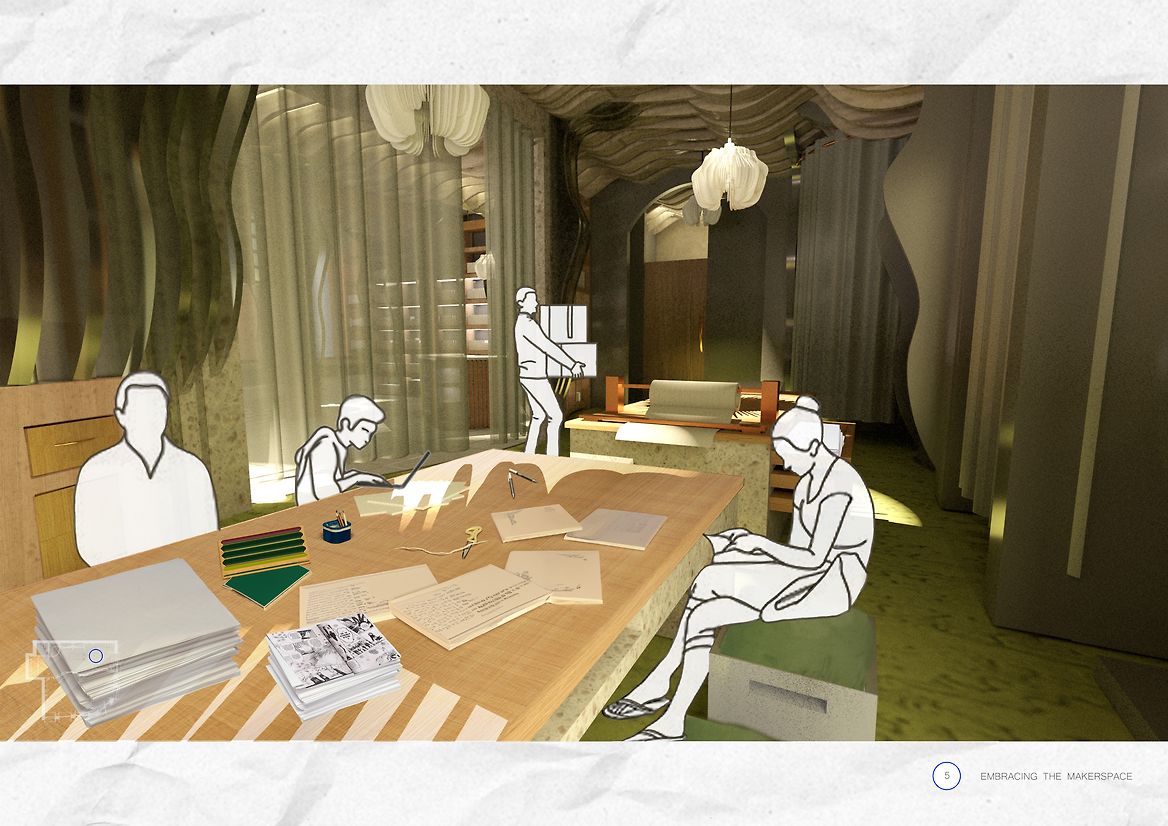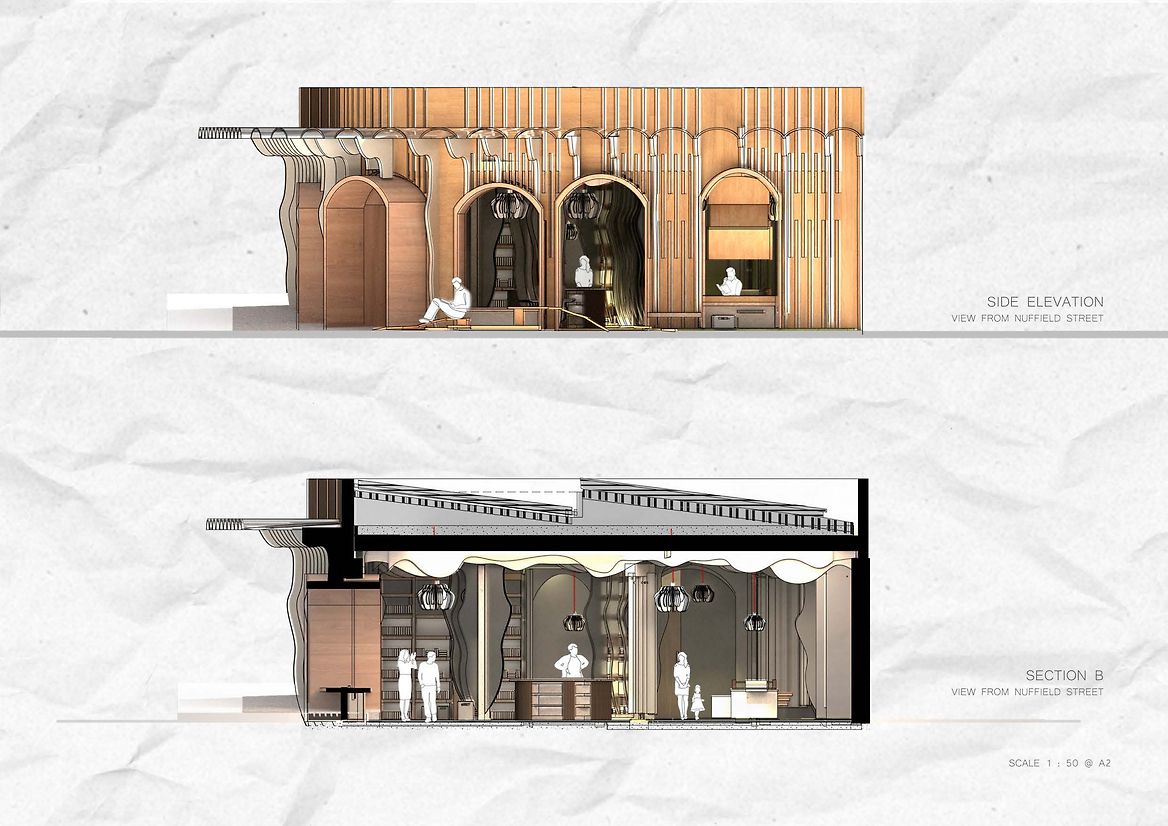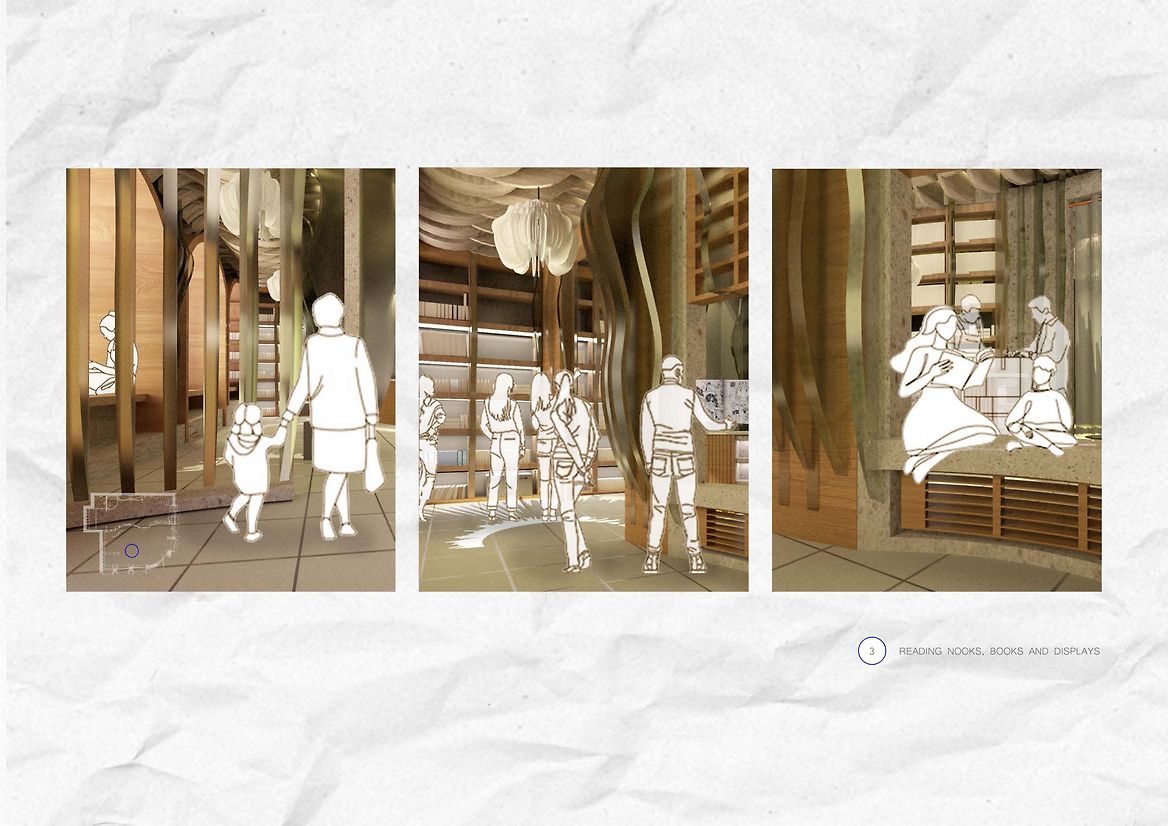 Thought was given to the transitions of retail space and the playfulness of the subtle and overlooked in-between spaces and voids with activation from the inside to outside. As you nudge the revolving doors with a glimpse of the interior, you transition into the space as if you have jumped into a manga yourself. You are greeted by the soft textures, light and blurred contoured detailing on the wall as you gently follow through to the counter. Those walking by are invited to read and rest in the window reading nooks. Artists, artists in the making and anyone interested are encouraged to use the large, communal tables to work on producing their own graphic novels, manga, zines, and other paper publications to offload and float into creativity.