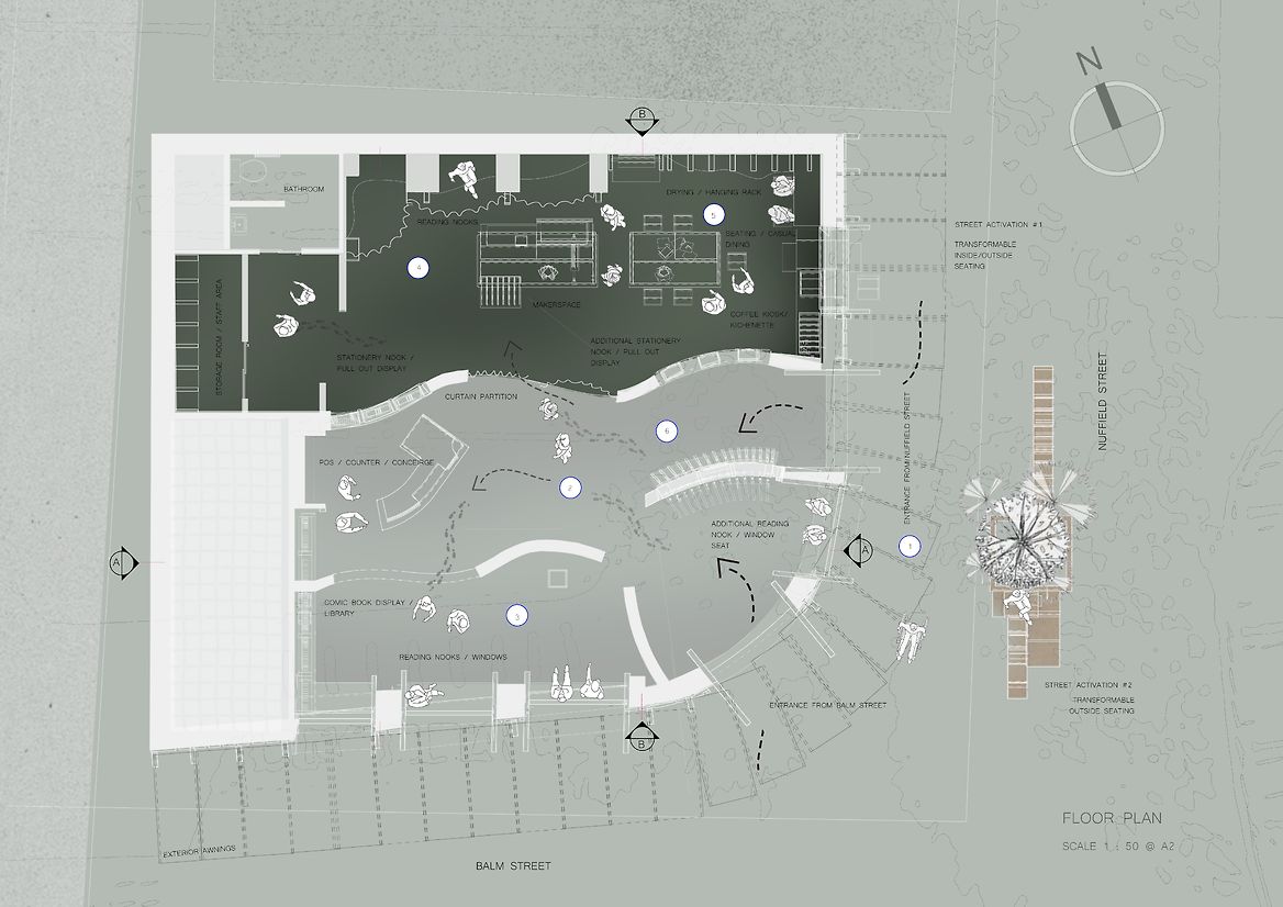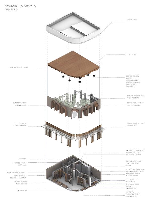 'Tanpopo' (Japanese for ‘dandelion’) is a graphic novel retail store based on nostalgic memories of reading manga in the basement of Borders on Queen Street in the mid-2000s. It gathers a community with an interest in producing their own personal graphic novels whilst sparking the child-like feeling of "chasing dandelions", off-loading heaviness and encouraging creative freedom.