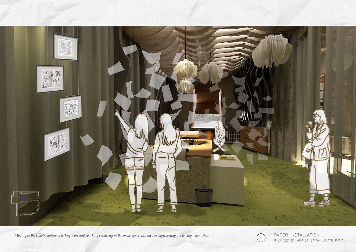 The intention behind the design was to create a space that was naïve, approachable and light-hearted, whilst evoking childhood nostalgia of blowing dandelions also inspired by the Manga "Imadoki!" in which the storyline focuses around high school students starting a gardening club and gifting dandelions plants. Elements in this space are also in response to the 'comic gutter', the forgotten framework and space of a graphic novel.
