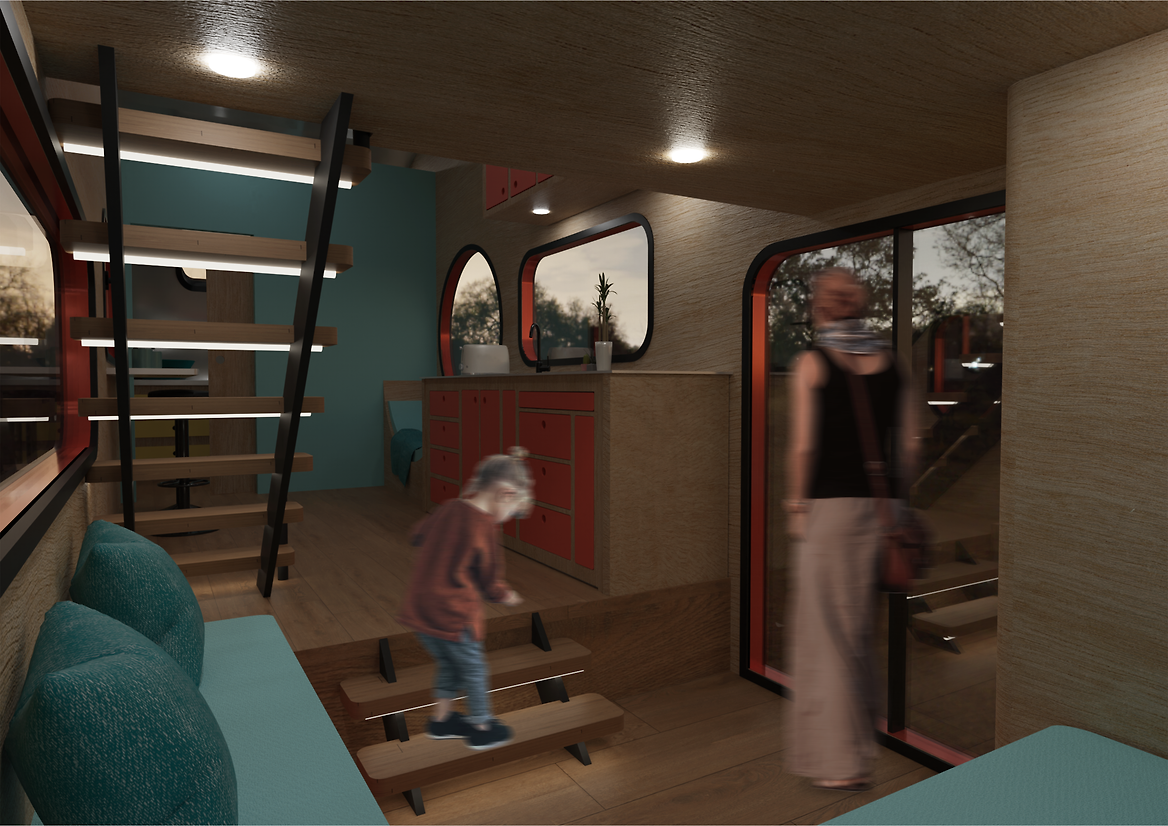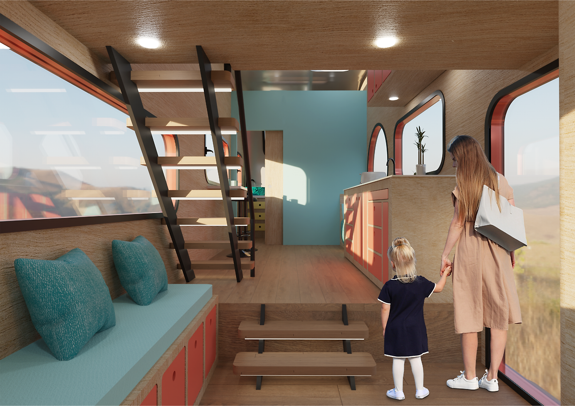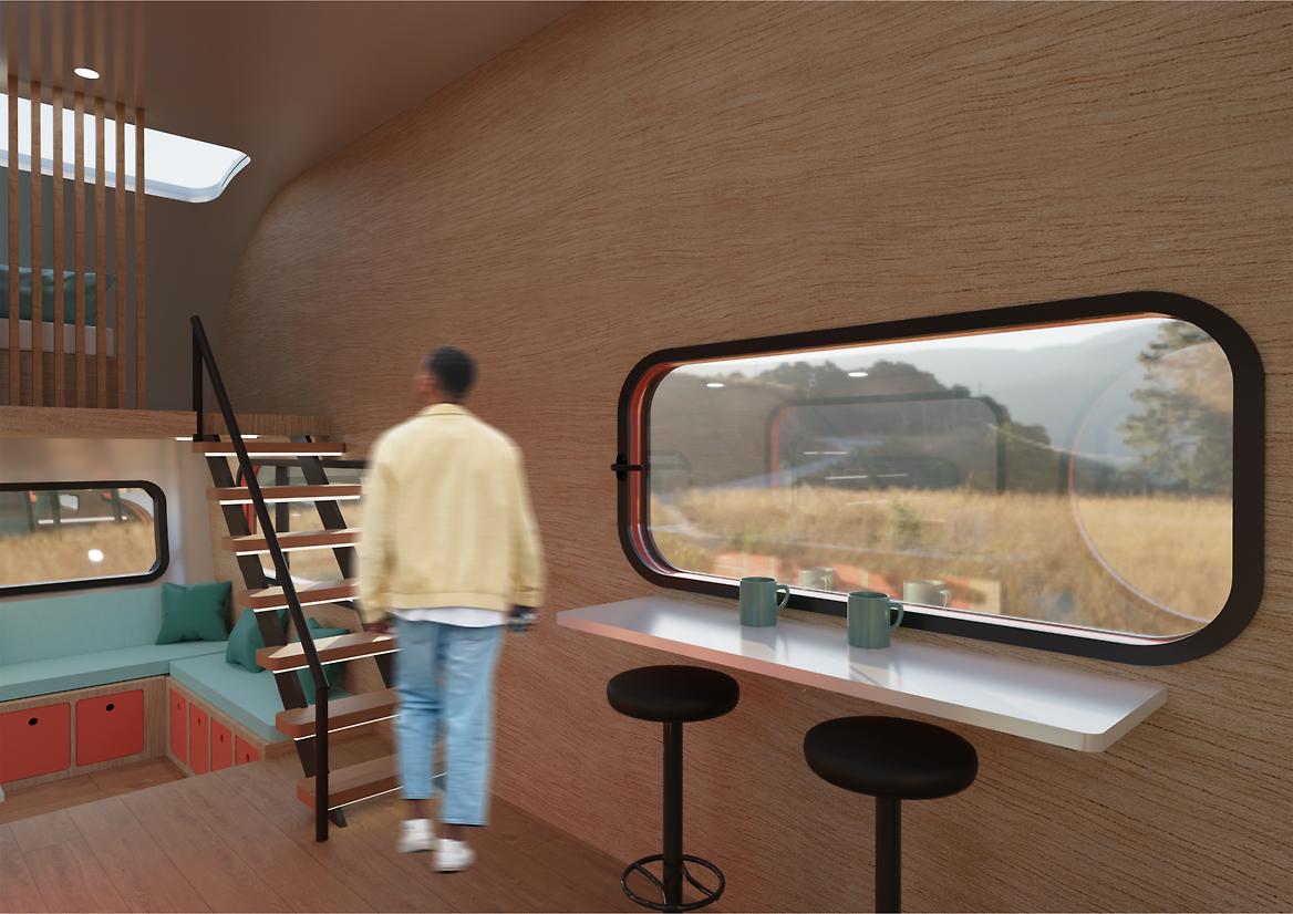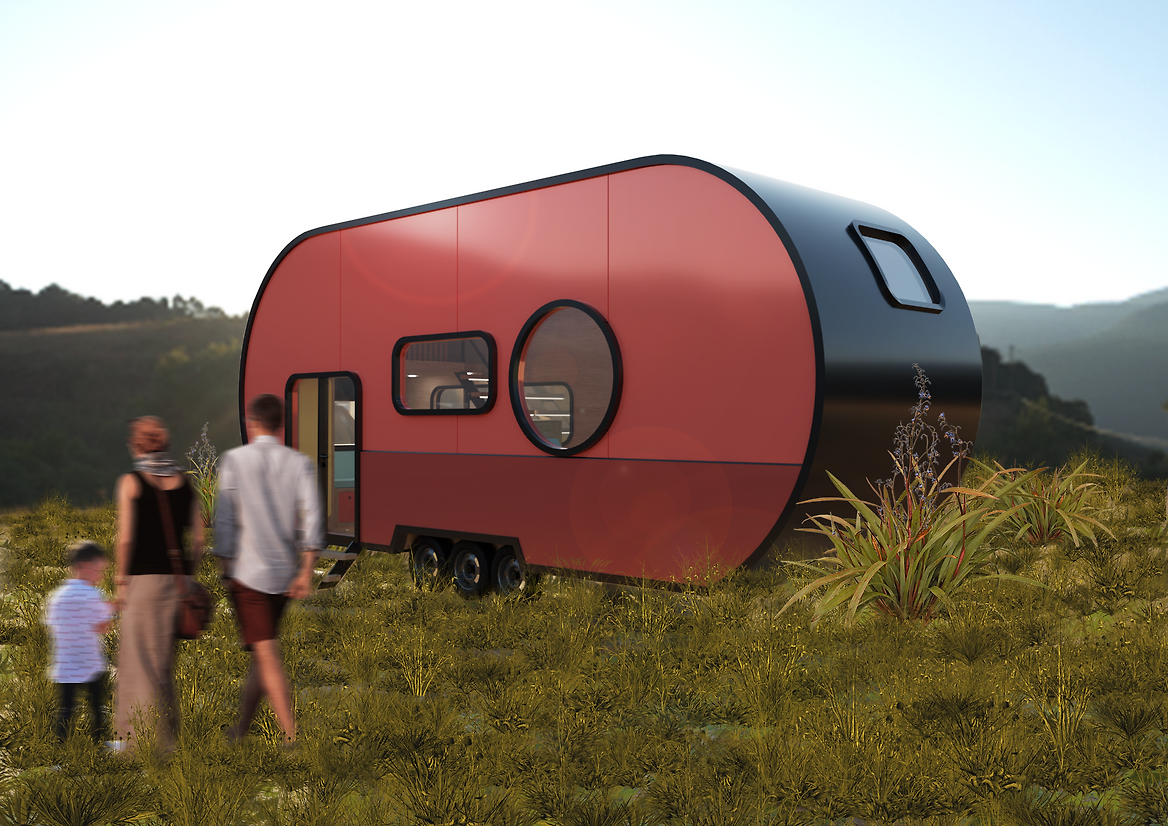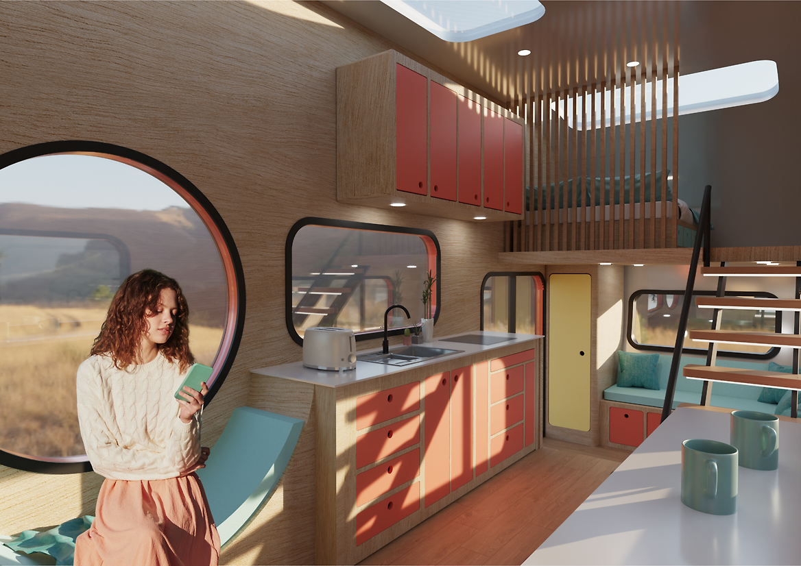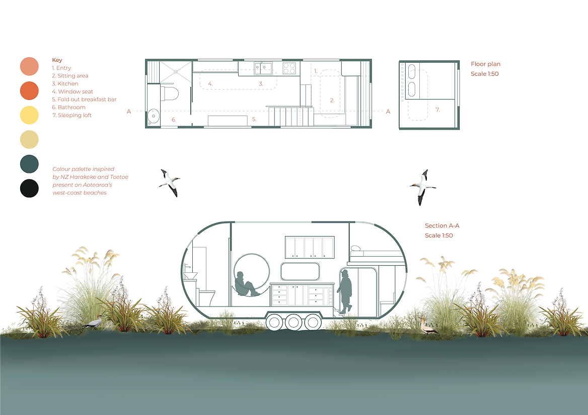 The Capsule Home is a mobile tiny home designed for recreational travel in pursuit of some of Aotearoa’s most breathtaking scenery and wildlife. The design draws from the classic airstream caravan, as a historical part of the origin of the tiny home movement. The bold interior encapsulates the airstream time period, featuring the iconic 1960’s colour palette, club-style seating, brightly coloured lacquered cabinetry and plywood panelled walls.