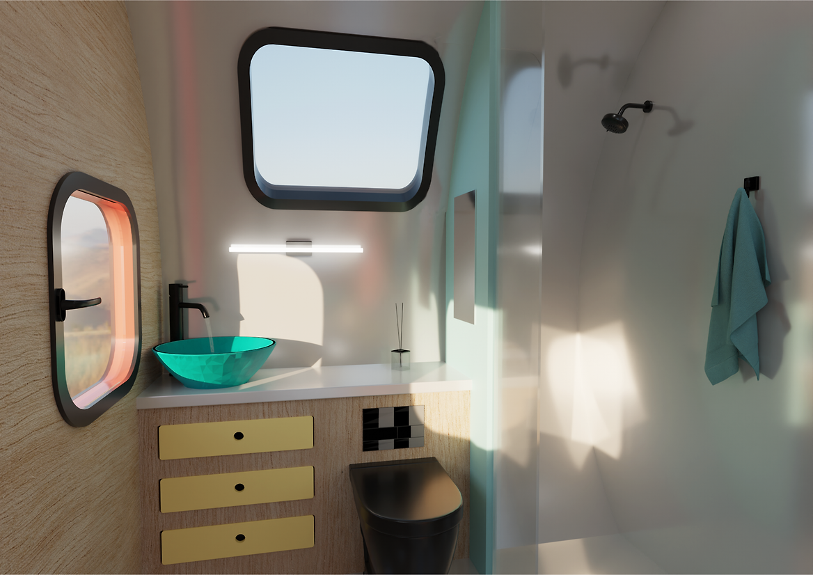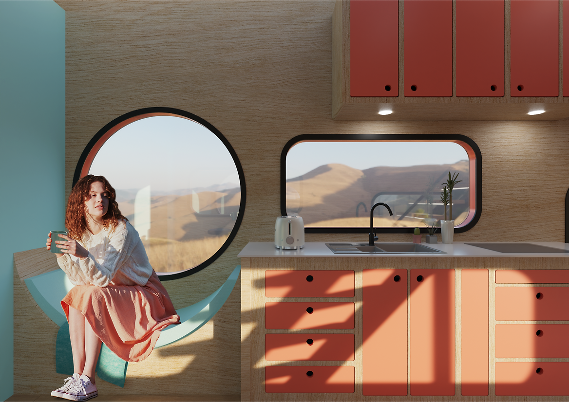 The Capsule Home is designed to emulate the beauty of Aotearoa’s rugged windswept western coastlines. The black aluminium joinery and curved exterior shell celebrate our enchanting black sand beaches and the glimmer of the iron sand in the summer solstice. The coral-coloured kitchen cabinetry reflects the inside colour of the Harakeke flax, while the yellow cabinetry symbolizes the native Toetoe, a common feature of Aotearoa’s west coast beaches. The expansive blue of early morning skies are a highlight of the space, recognised in the fabric of the club-style seating and feature wall dividing the kitchen and bathroom. The ‘sitting room’ sits lower than the rest of the room, creating a break from the rest of the space. This moment of interactivity adds to the feeling of playfulness within the space and gives evening entertainment a more intimate ambience.