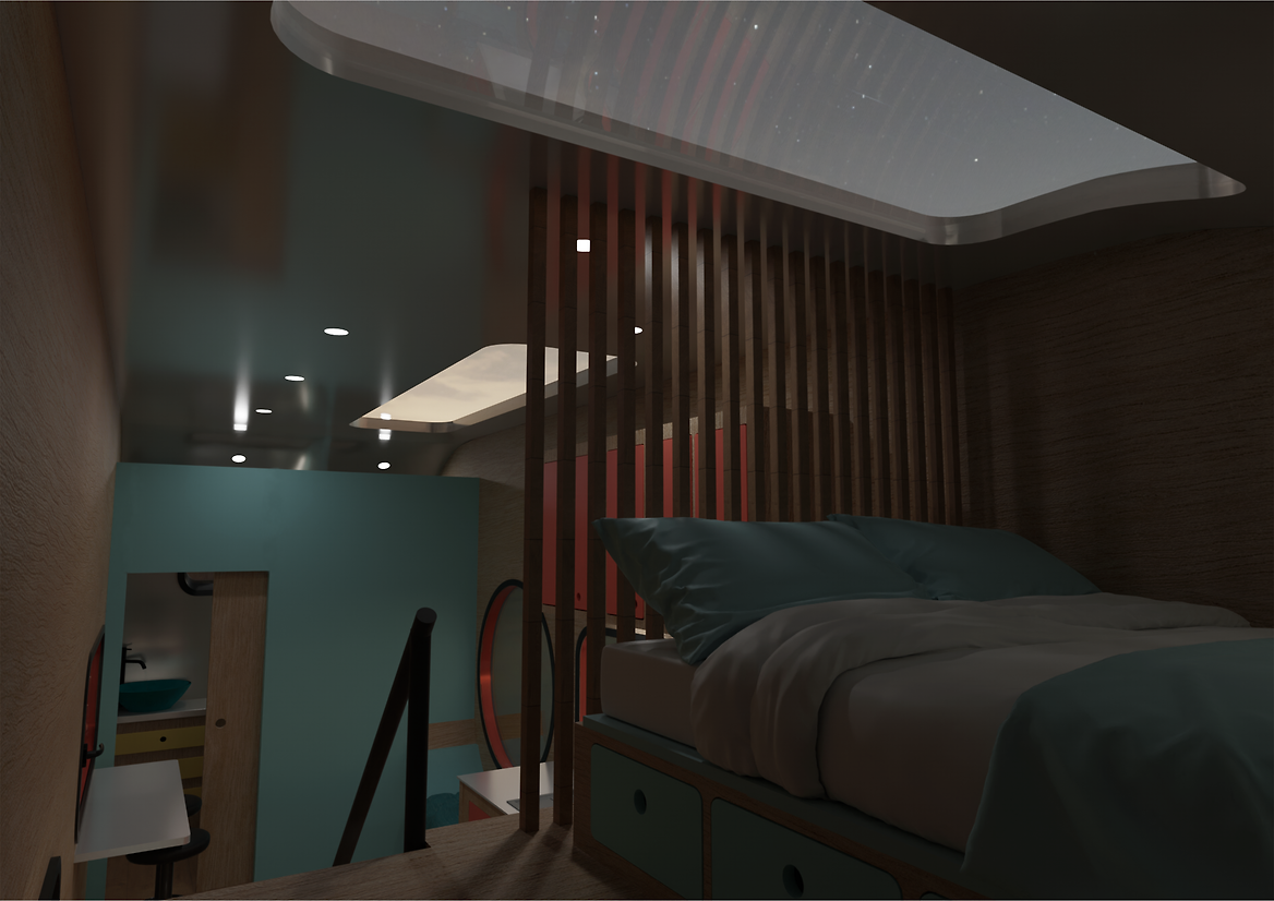 This space works to balance the efficiency of small space living with the delights of life on the move, making the experience of travel more memorable. The Capsule Home features a built-in window seat situated beneath a large circular window, offering a view to the world outside. Two large skylight windows, one situated above the kitchen, the other above the sleeping loft, on those mild summer evenings beckoning you to fall asleep beneath the starry night sky.