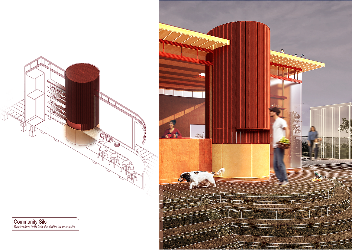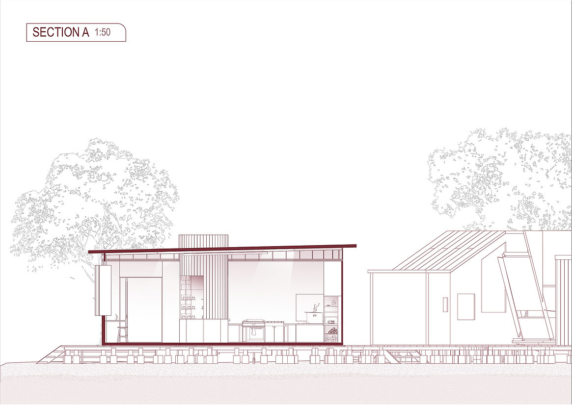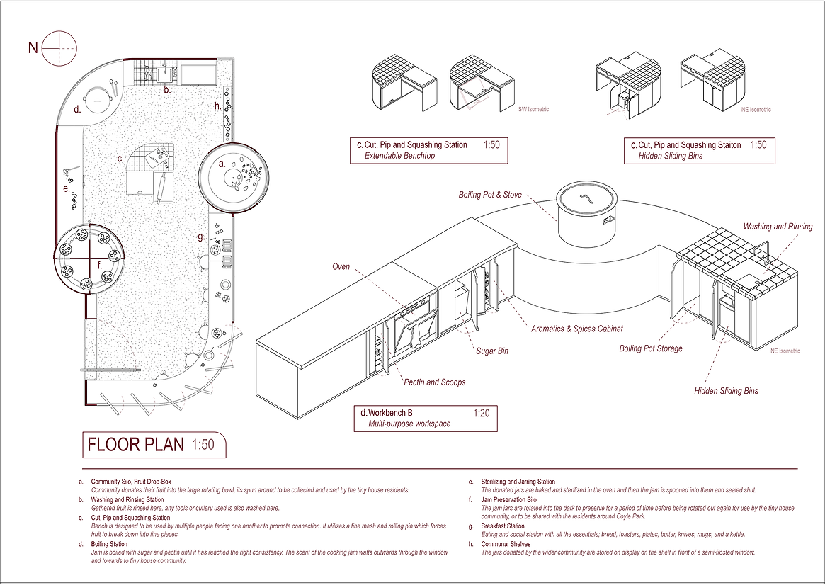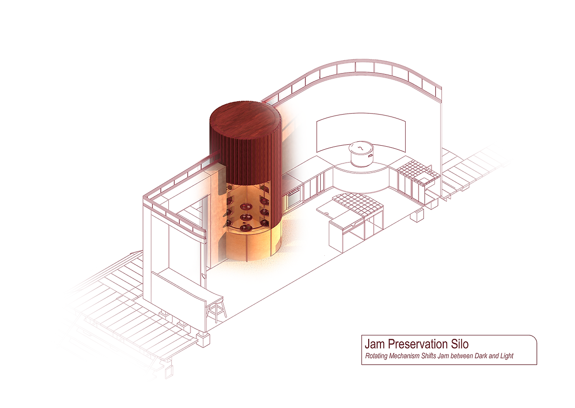 The Silos are designed to reflect the periods of change, settling and rotation expected to occur in the tiny house community, where not all inhabitants are permanent. Shelves in one silo rotate on tracks shifting in between dark and light spaces for jam preservation. A large preserving pot holding boiling Jam sits next to the sliding window so the sweet, sticky scent wafts through the air, inviting conversation with local passers by about the preserving processes being undertaken. Overall, JAM House serves as a catalyst for social activity and community integration within the cohousing environment.