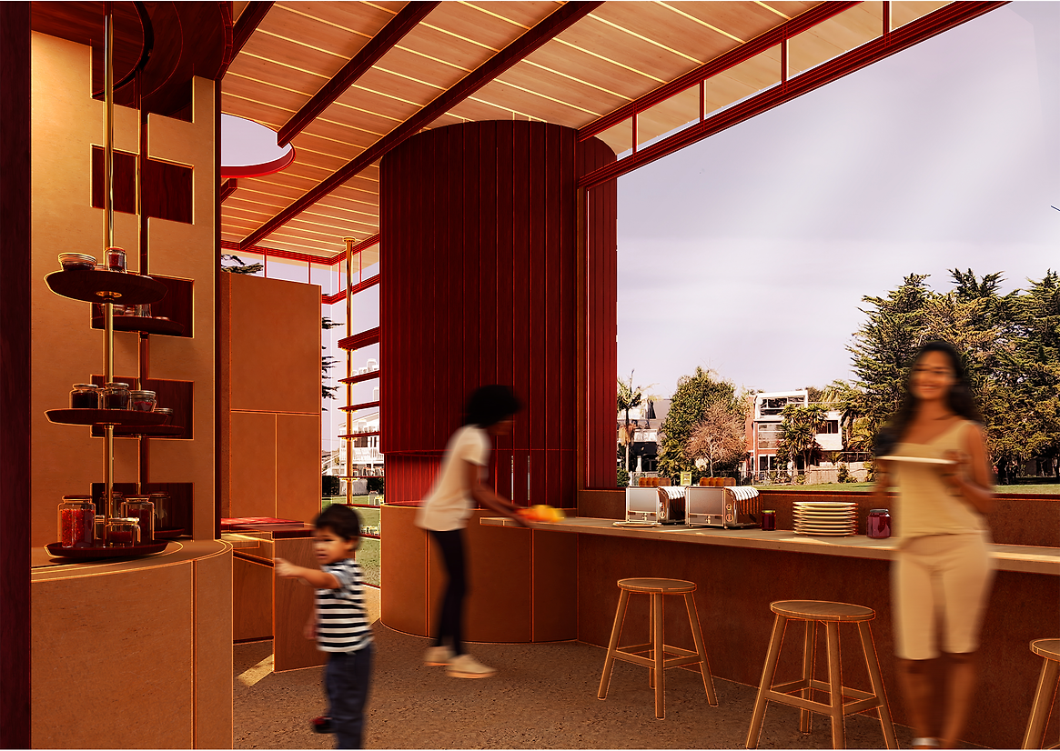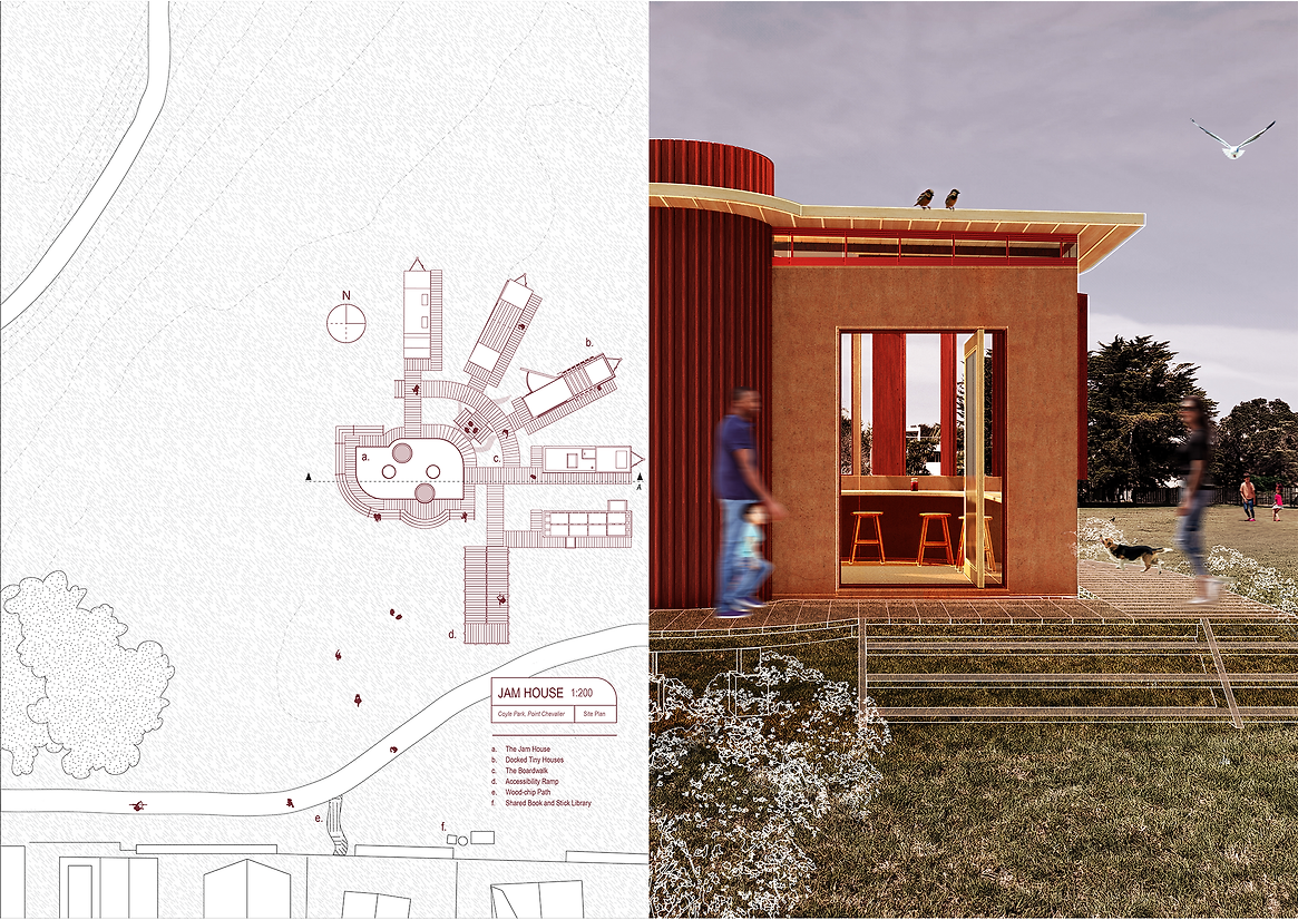 JAM House is Breakfast and jam making space for a proposed tiny house community in Coyle Park, Point Chevalier. The project explores how a shared amenity could serve both the co-housing community and wider neighborhood as an initiator of social activity. Jam house was designed to be a meaningful, gentle and inviting addition to Coyle Park fostering social interaction and cohesion through the process of jam-making, inviting both residents and the wider neighborhood to participate. The tiny house community consists of each of our individually designed tiny homes which were intended for transitional residents.