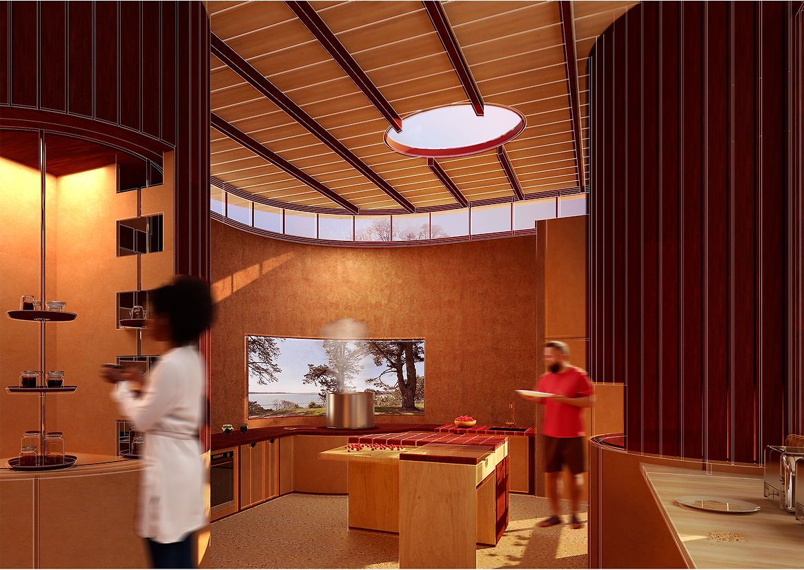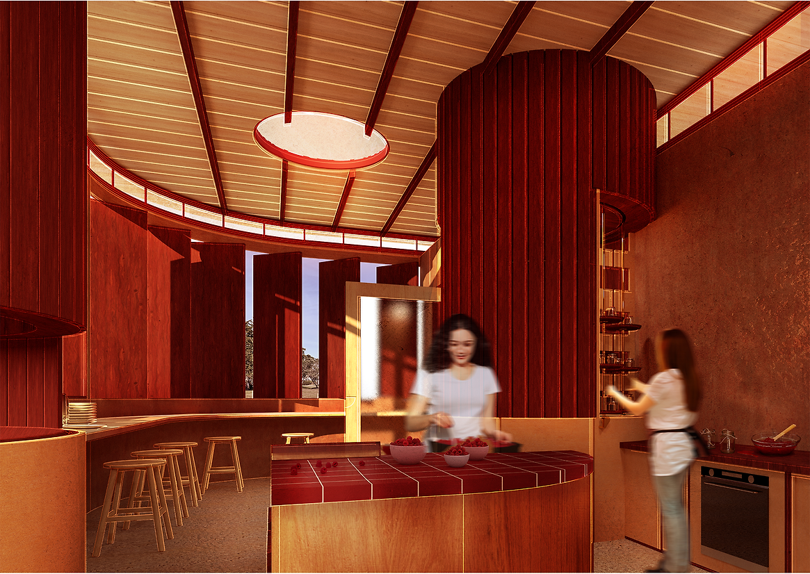 The amenity is divided into two main spaces, the preservation space and the breakfast space. The preservation space includes bespoke jam-making stations for washing, crushing and boiling the fruit as well as spaces to store the sugar and pectin, to hang tools and an oven to sanitize jars. The materiality reflects the color richness in jam making and encourages staining and marks. Jam House invites the wider neighborhood to exchange fruits for jams made by the residents through engagement with silos: one silo has been designed for the preservation of jams and the other for the collection of fruit.