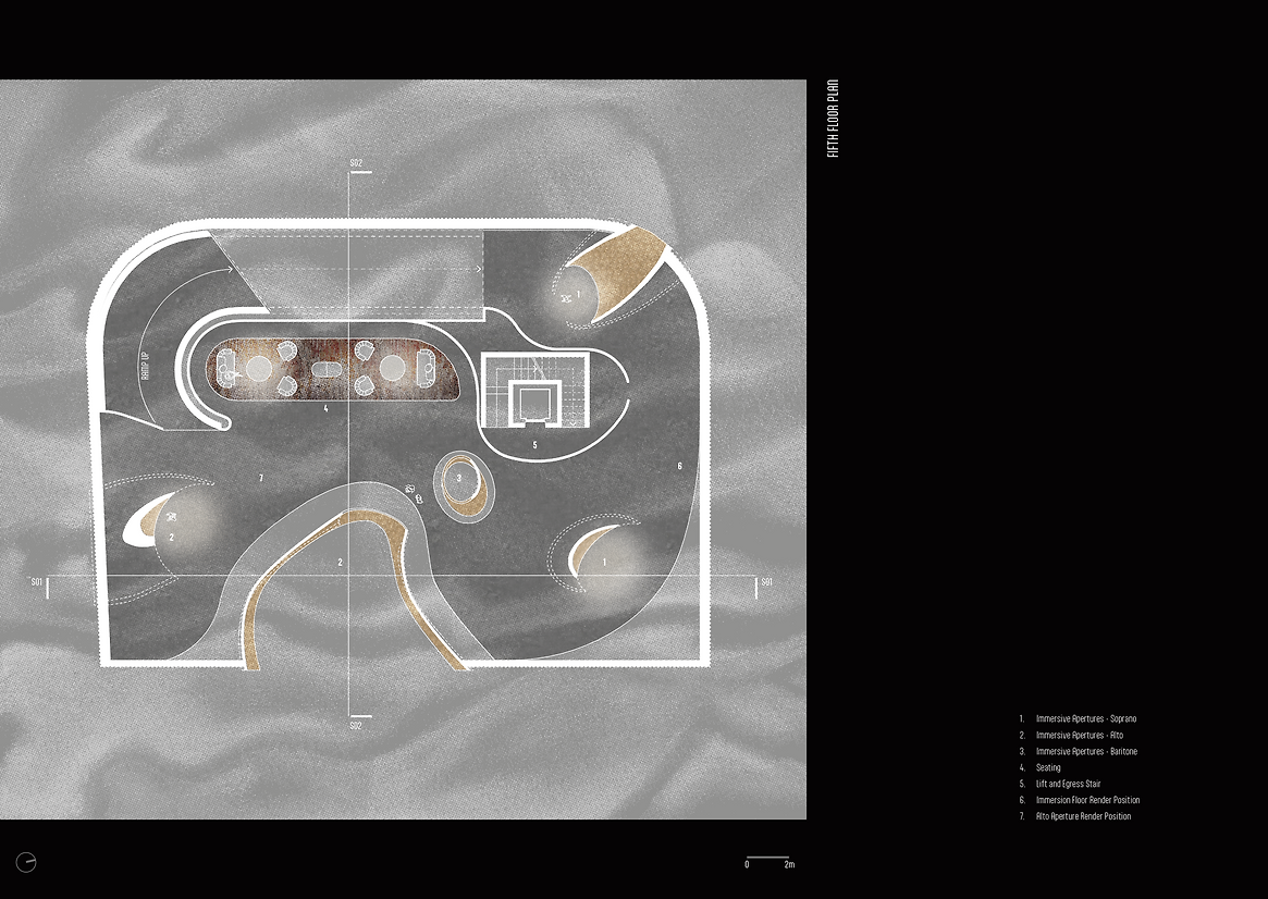Within the membrane, the spatial experience is distorted by moments of compression and dispersion. Organic curves and bulbous forms interrupt the rigid skeleton, hinting at the passages that twist through our body carrying life and sound. The journey begins with an intimate, inward experience, disconnecting one from the site’s familiarities. Embracing the inherent movement of the car park’s retained ramps, visitors ascend the winding path through the skeleton. Level five is the nexus of optical and aural distortions as Auckland City leaks in. Immersive apertures splice the city’s choral voice. Baritone, alto and soprano are heard in isolation: the deep rumble of traffic; up to the howl of the wind; the squawk of resident birds overhead. Upon descent, the audience retraces their steps, revealing visual, aural, and emotional qualities undiscovered on ascent.