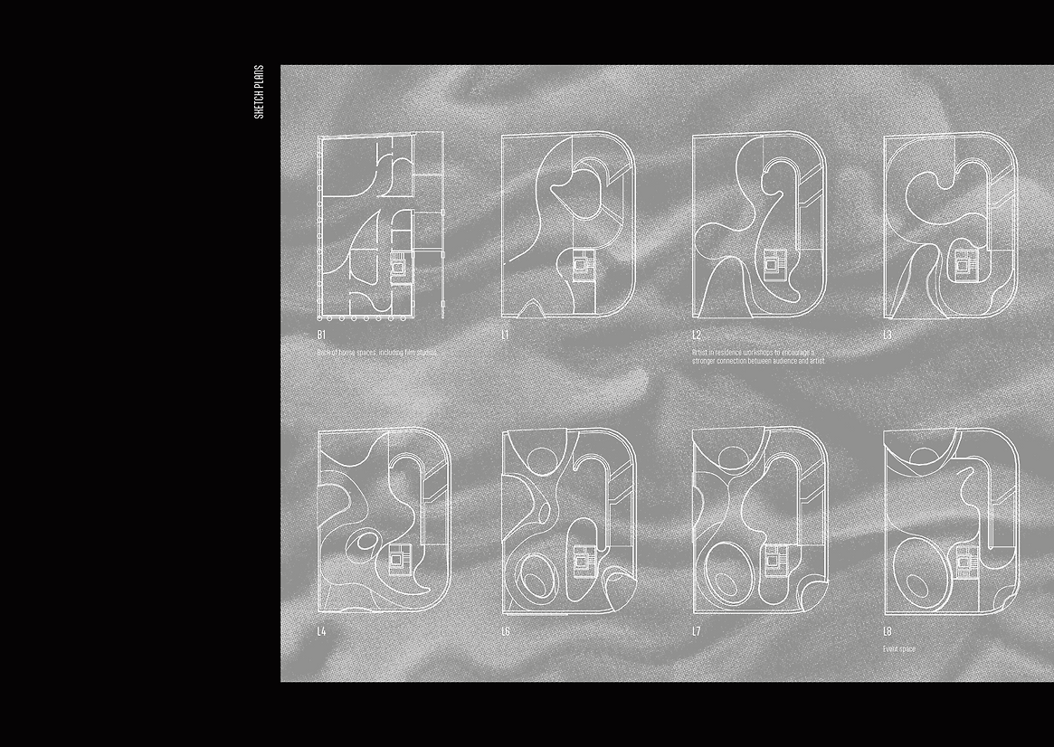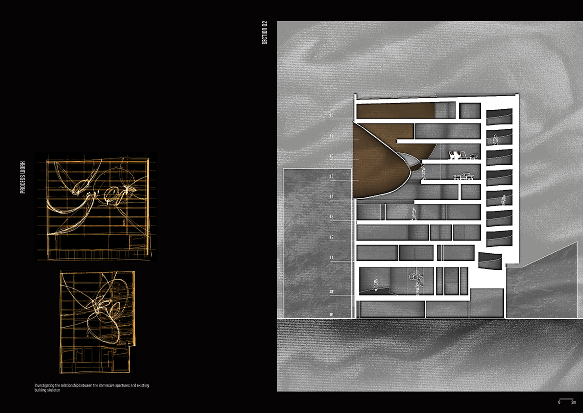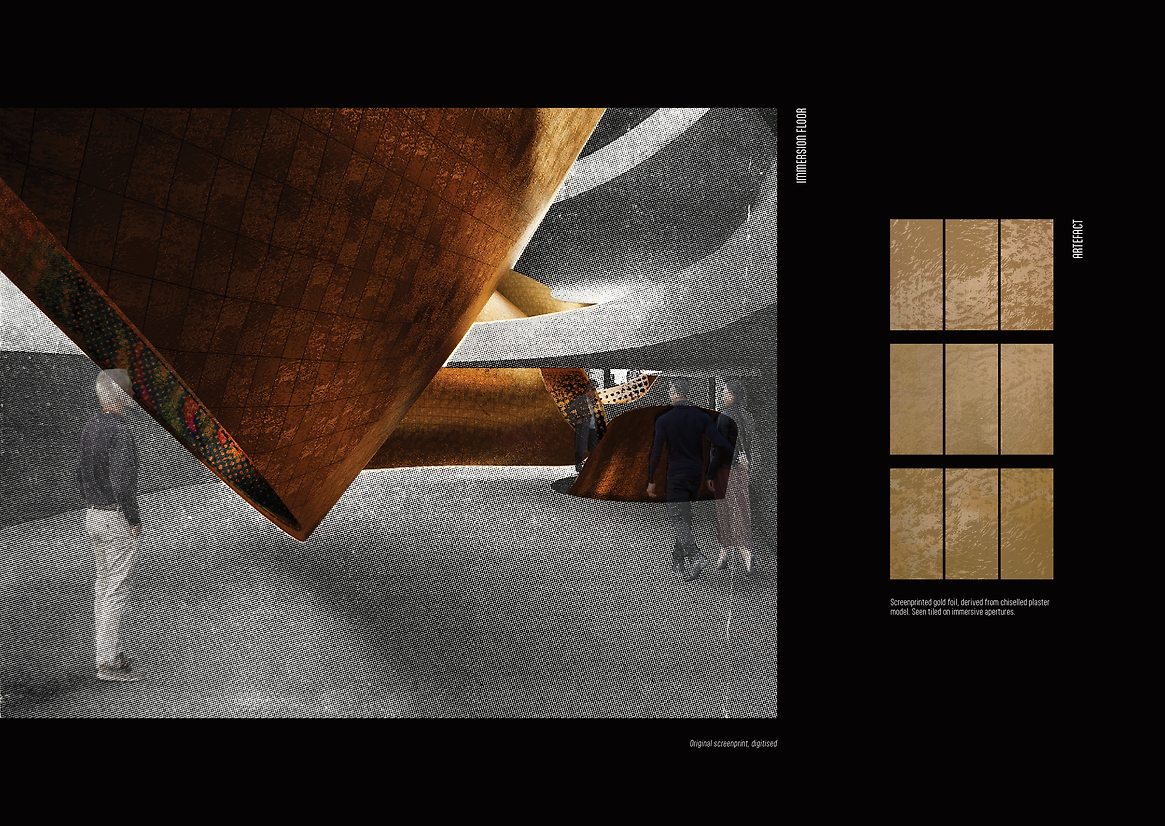 Urban Apertures is a porous structure, a perforated membrane, joining the city and cinema. Sweeping gold apertures puncture the existing steel and concrete skeleton of the car park building. This porosity exposes a blurred threshold between the immersive cinematic experience within and the bustling urban landscape beyond. The world beyond the walls leaks in and the world within the centre leaks out, capitalising on the duality of public and private space. Fort Lane and the car park building are therefore re-scripted through projection, and sound.