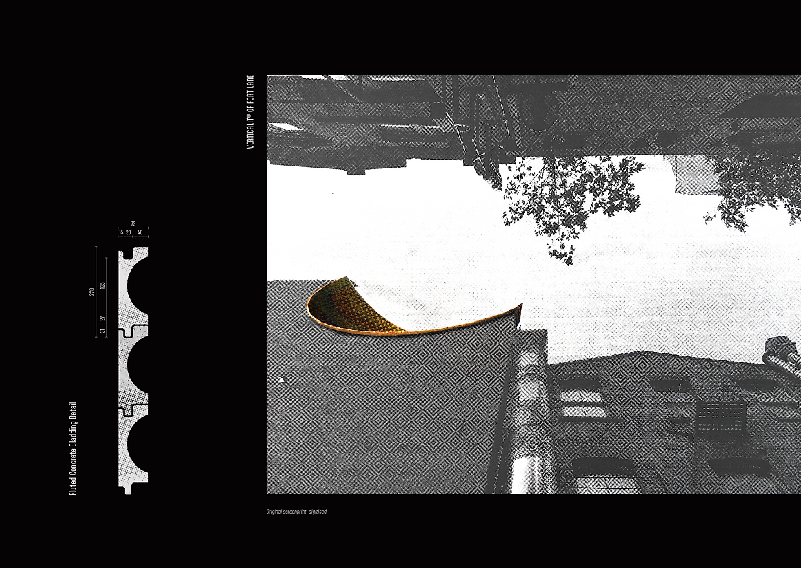 The porous structure responds to the city’s voice and movement as the apertures become a vibrant beacon for all city dwellers. Shifting our gaze up from Fort Lane, the verticality of this site is realised as we stand engulfed in its shadow. The unwavering vertical lines of the fluted concrete facade play into the exaggerated perspective from the narrow site. Carved-out immersive apertures interrupt the directionality that overwhelms our urban landscape.