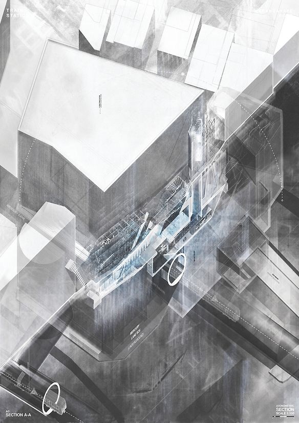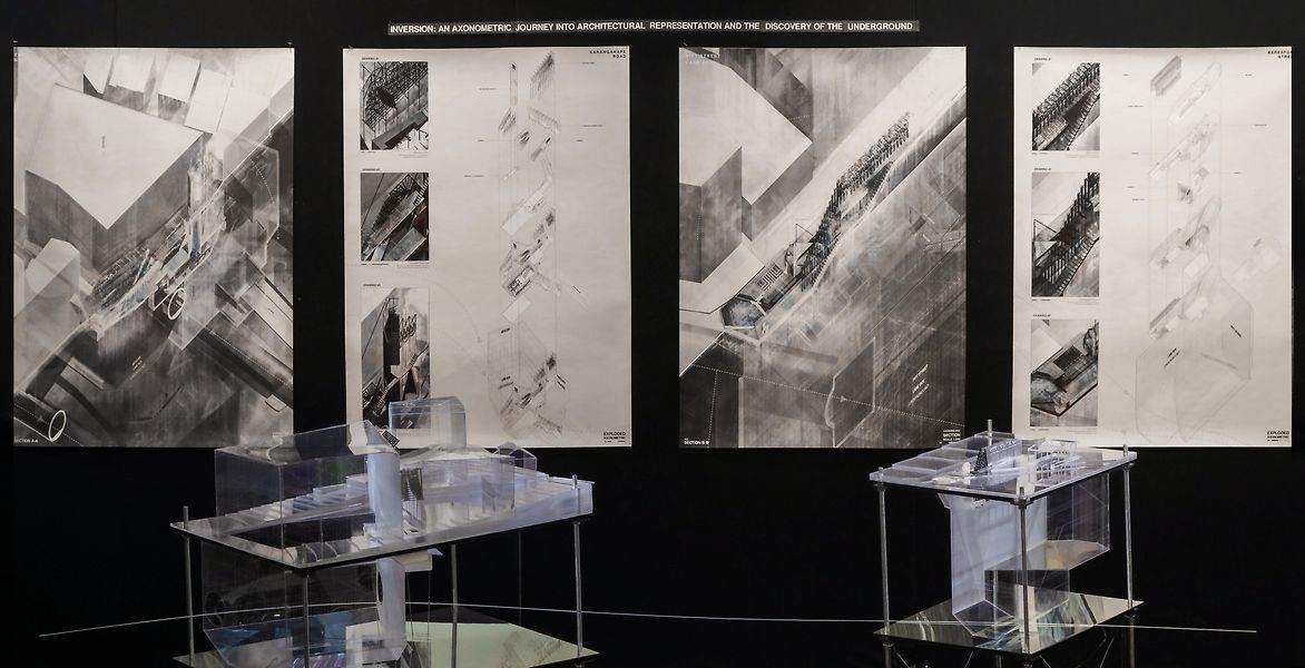 The project innovates by challenging conventional axonometric drawing to create a new form of expression in architectural media, shifting its role from a representational tool into a dynamic design catalyst. Using the concept of inversion, three aspects foreground the investigation into the underground: above/below, light/darkness, and conceal/reveal. Specifically, the design focuses on forms generated by the axonometric’s unique 45-degree angle and the experimentation of various material mediums, such as cyanotype drawing on fabric, plaster and paper. The use of cyanotype as a central medium allows for opportunities to transform the architecture into a canvas for light, shadow, and time. The underground train station uses light thresholds such as slits, openings, and voids to achieve this effect. The underground rail link is revived into life through the elemental (light) and the physical (drawing).