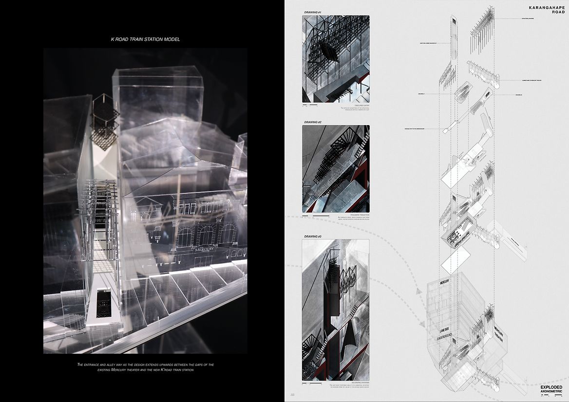 This project embarks on an axonometric journey through the concept of inversion, shedding light on the hidden underground spaces of the city, specifically Auckland’s underground railway links. The design integrates into Auckland's Karangahape Road City Rail Link Station and the Pitt Street Lane Box, offering slices of light and darkness as users transition between surface and subterranean spaces on their daily commute through the urban labyrinth of the city.