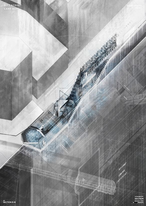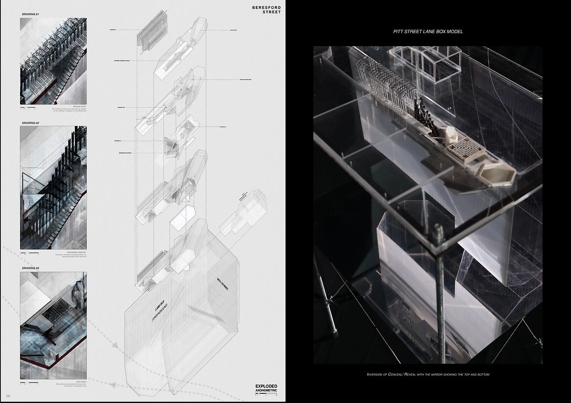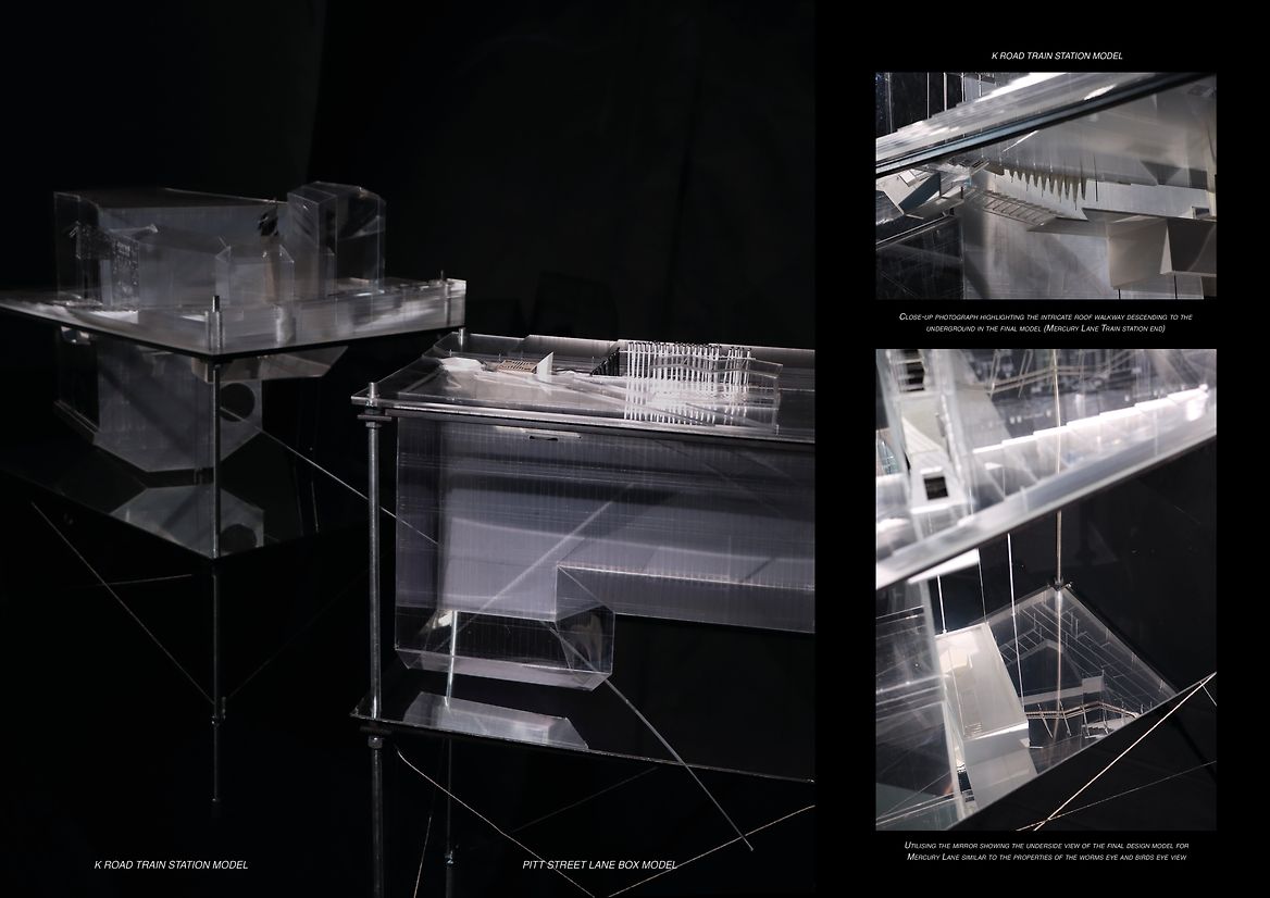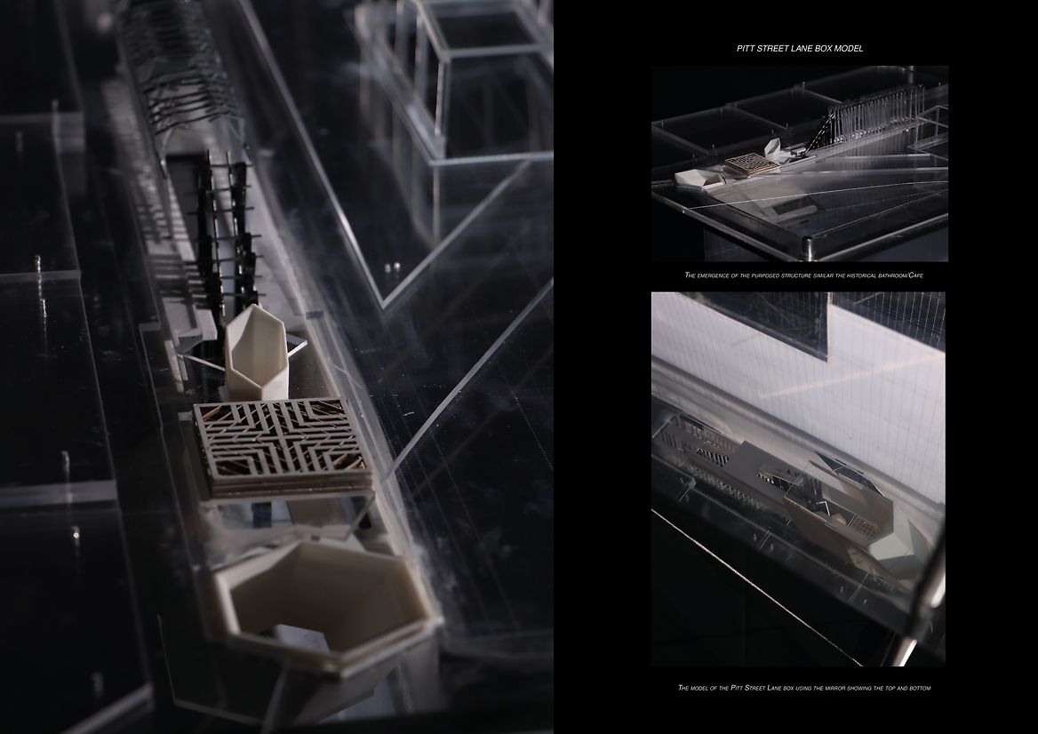 The proposed interventions at each end of the new train stations currently under construction serve as “shadows/ghosts” to the main entry spaces for the City Rail Link stations. It establishes connections between the design of the new train station and the historical underground systems and above-ground spaces, aiming to bridge the gap between modern development and heritage. The project achieves regenerative outcomes as the resulting train station design becomes a recollection of the historical underground bathrooms and sites that were lost. The ghosts of the site include the Pitt Street underground bathroom, later transformed into a café. The café’s layout was then replicated in the proposed design for Beresford St/Pitt Street, integrating the functions of the bathroom/café back into the site. The Mercury Plaza, once a vibrant supermarket and food court, is also reintroduced into the project in the Mercury Lane/Cross Street design and attaches itself between the Mercury Theatre and the new train station, emerging through the alleyway in between the two buildings.