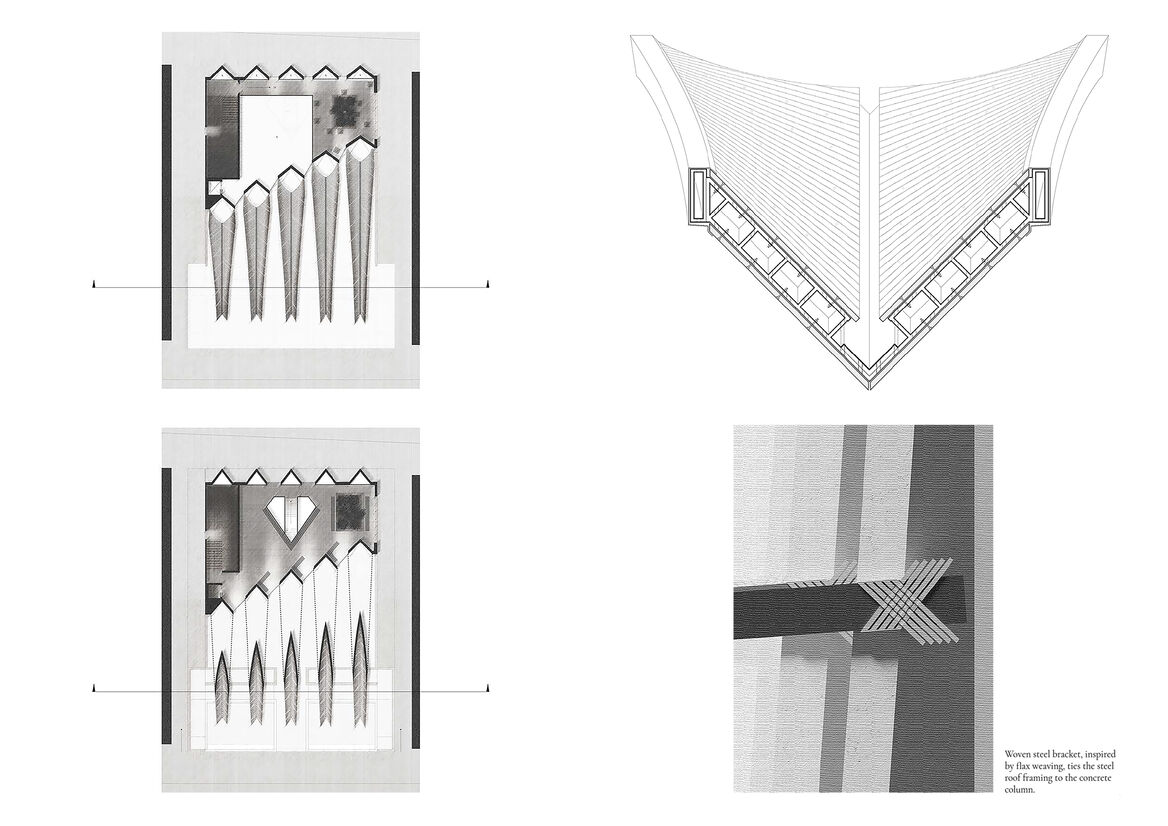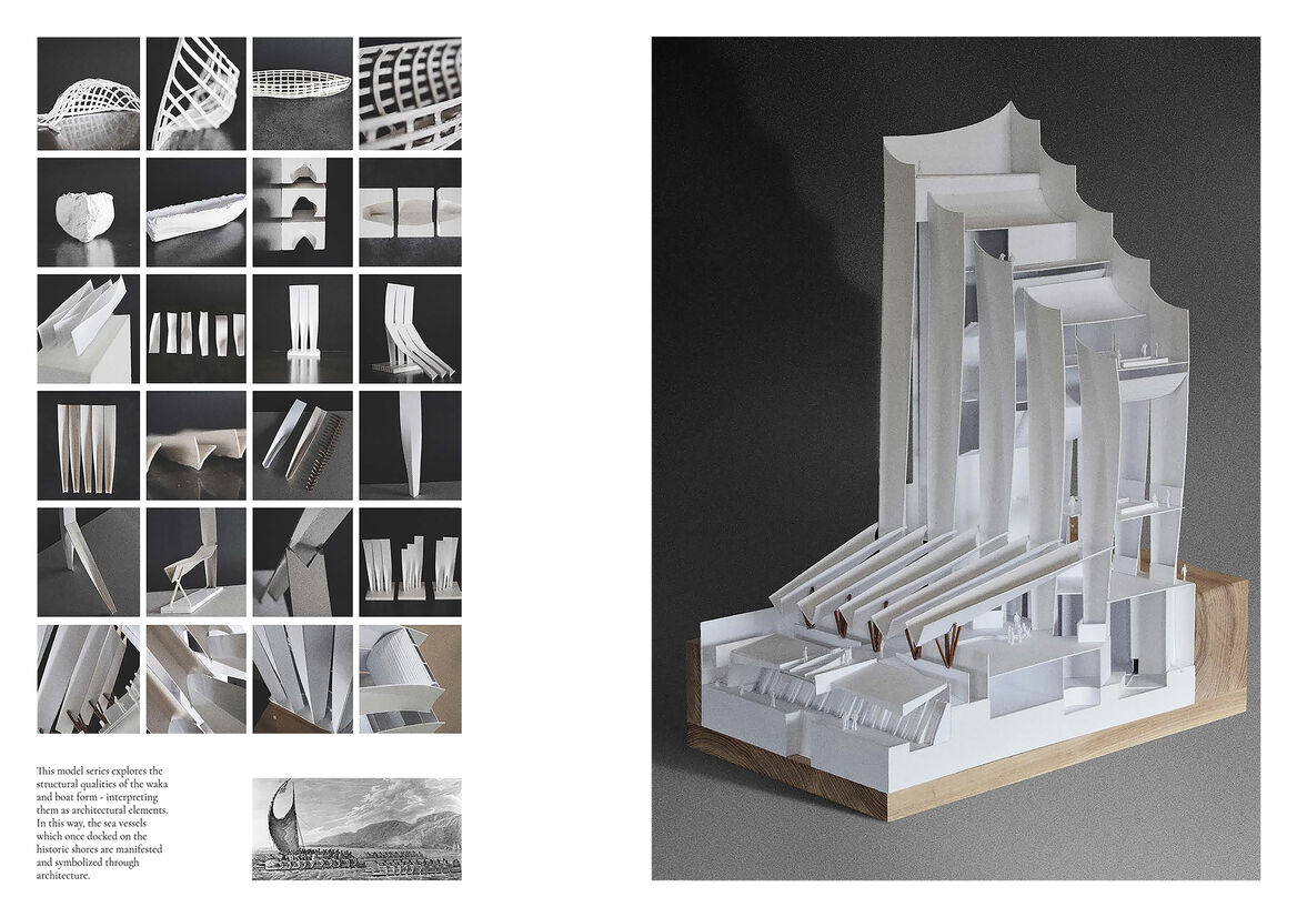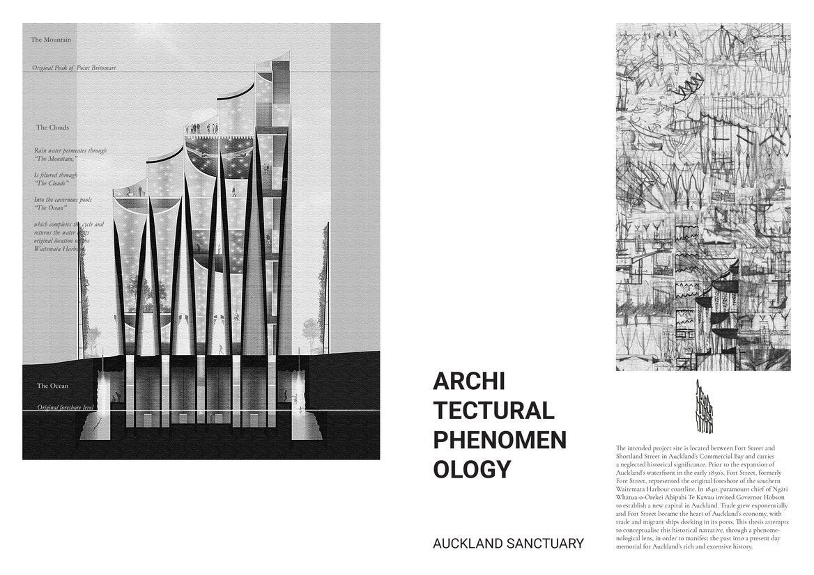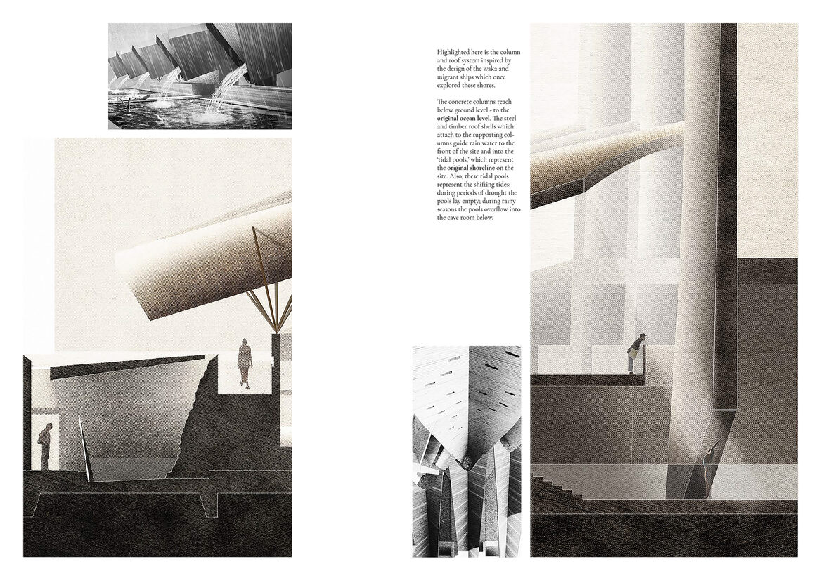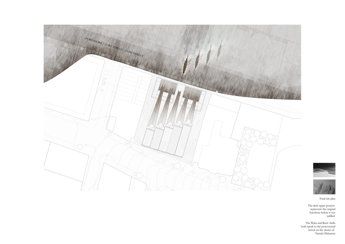 This thesis conceptualizes the first arrival of Waka on the shores of the Waitemata Harbour into shell like roof and column structures which crash upon each other to form the crux of the building. Located on Fort Street, formerly Fore Street, this urban sanctuary embodies the history of the site and our predecessors through three primary components – The Ocean; The Clouds; The Mountain.