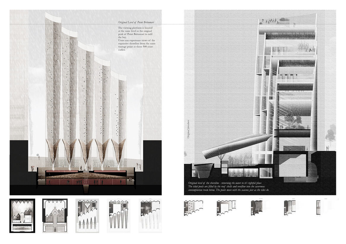 The intended project site is located between Fort Street and Shortland Street in Auckland’s Commercial Bay and carries a neglected historical significance. Prior to the expansion of Auckland’s waterfront in the early 1850’s, Fort Street, formerly Fore Street, represented the original foreshore of the southern Waitemata Harbour coastline. In 1840, paramount chief of Ngati Whatua-0-Orakei Ahipahi Te Kawau invited Governor Hobson to establish a new capital in Auckland. Trade grew exponentially as trade and migrant ships docked its ports. Soon after, point Britomart was completely excavated in order to infill the bay and provide for a growing city. This thesis attempts to conceptualize this historical narrative, through a phenomenological lens, in order to manifest the past into a present-day memorial for Tamaki Makaurau’s original topography and rich history.