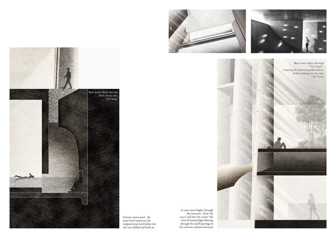 This thesis conceptualizes the first arrival of Waka on the shores of the Waitemata Harbour into shell like roof and column structures which crash upon each other to form the crux of the building. Located on Fort Street, formerly Fore Street, this urban sanctuary embodies the history of the site and our predecessors through three primary components – The Ocean; The Clouds; The Mountain. “The Ocean” is formed by a cavernous system of pools below ground level which reach down to the original water level. The waka-inspired roof shells direct rainwater into the tidal pools at the entrance of the site, right where the waves of Auckland’s bountiful waters once crashed against the shore. With the seasons, these tidal pools fill and overflow into the contemplation space below, returning the water to its rightful place. “The Clouds” are a series of internal structures representing Aotearoa / The Land of the Long White Cloud. These clouds form internal floors as well as external rooftop decks which allow rainwater to filter through them, watering the internal gardens, and eventually reach the cavernous pool system in “The Ocean.” The cycle is completed – water is once again returned to its rightful place. “The Mountain” is the highest point of the structure – a roof top deck which the user reaches once passing through the clouds. This space is located at the height of the original Point Britomart and allows users to experience views of the coastline just as those thousands of years before the experienced. The intended project site is located between Fort Street and Shortland Street in Auckland’s Commercial Bay and carries a neglected historical significance. Prior to the expansion of Auckland’s waterfront in the early 1850’s, Fort Street, formerly Fore Street, represented the original foreshore of the southern Waitemata Harbour coastline. In 1840, paramount chief of Ngati Whatua-0-Orakei Ahipahi Te Kawau invited Governor Hobson to establish a new capital in Auckland. Trade grew exponentially as trade and migrant ships docked its ports. Soon after, point Britomart was completely excavated in order to infill the bay and provide for a growing city. This thesis attempts to conceptualize this historical narrative, through a phenomenological lens, in order to manifest the past into a present-day memorial for Tamaki Makaurau’s original topography and rich history.