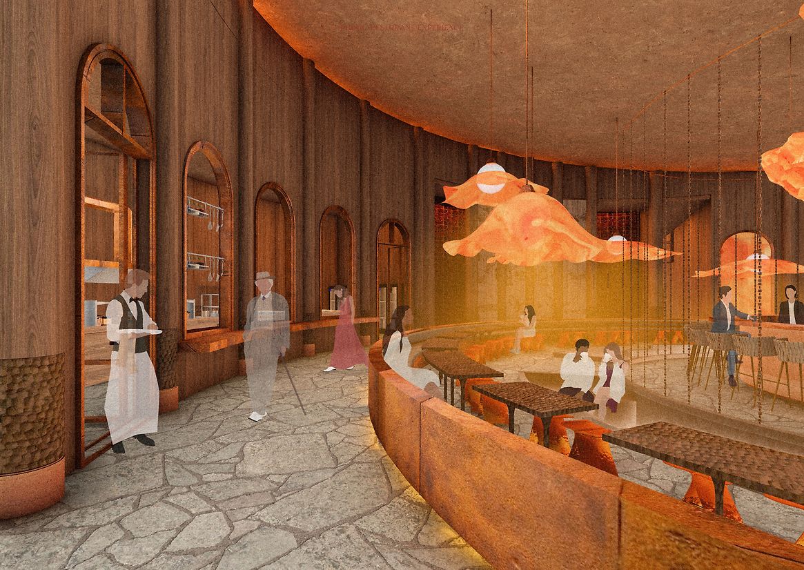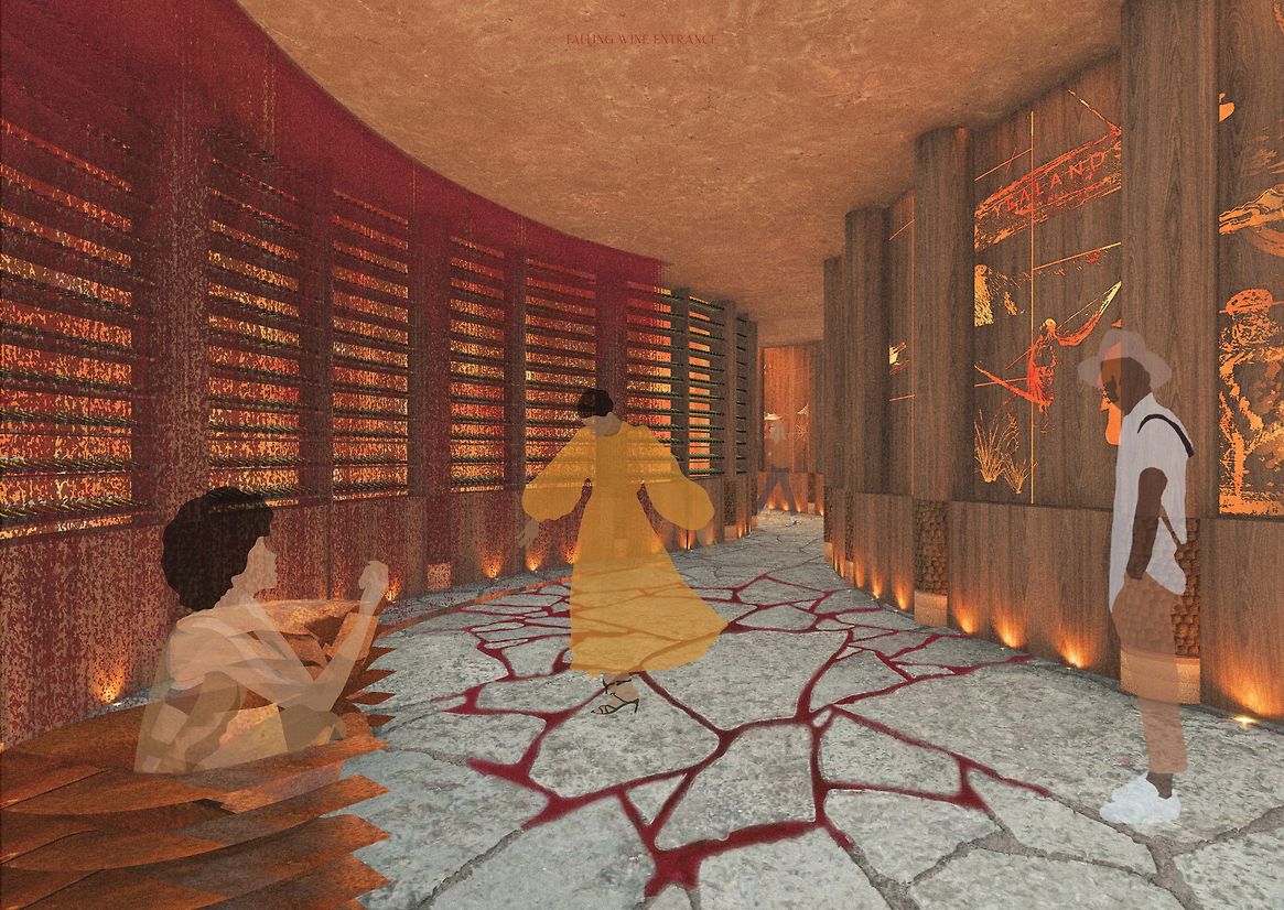 Visitors journey through a series of thresholds, moving in and out of compression and release. A wine waterfall murmurs ahead, scenting the air with the aroma of the vineyard. Wind harmonicas offer a soft, haunting melody. Light filters through in quiet patterns. Each step becomes a passage through memory, geology, and story.