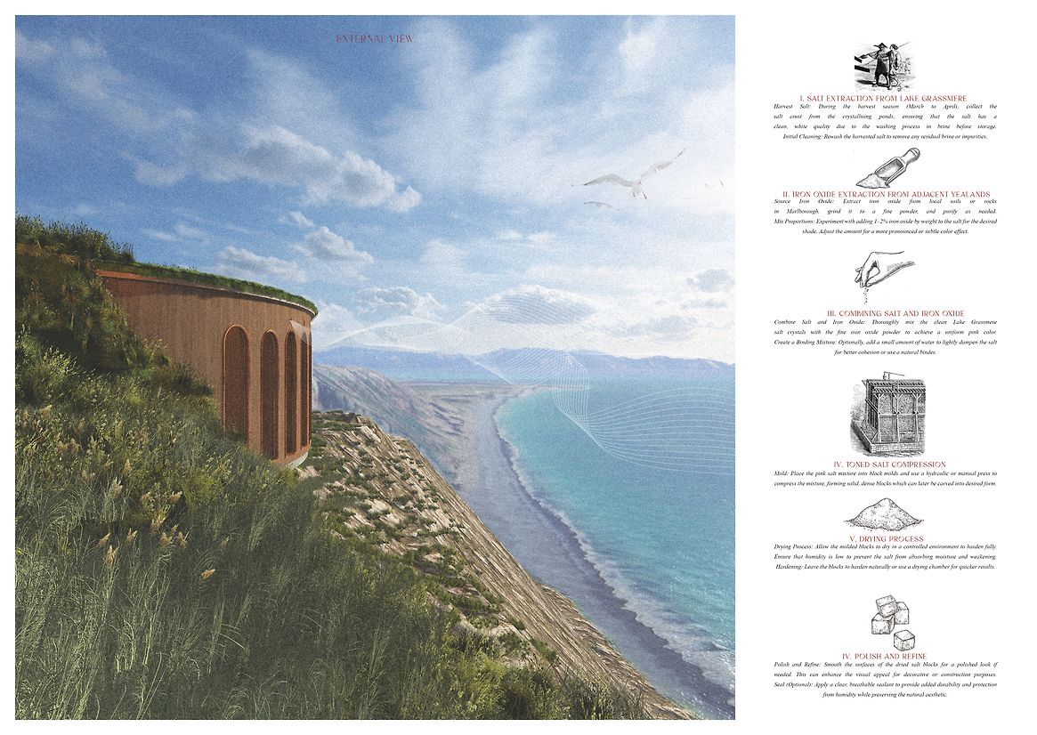 This interplay between permanence and change is also reflected in the project’s technical details. Salt, though inherently unstable, is carefully managed through climate control, allowing it to weather slowly over time. Its erosion becomes a form of storytelling. Biochar, created onsite from vineyard offcuts, replaces conventional grout in the rammed earth walls. These circular systems align with Yealands’ commitment to innovation and climate-positive production.