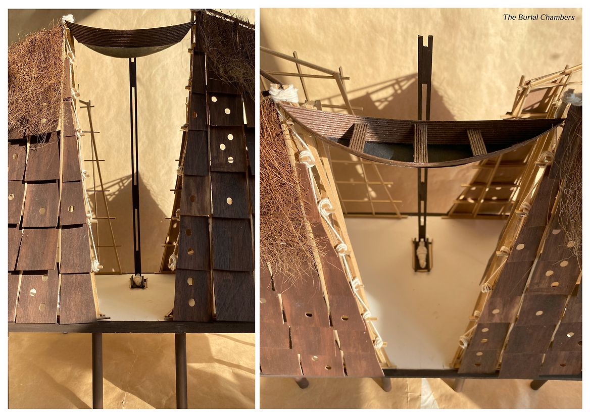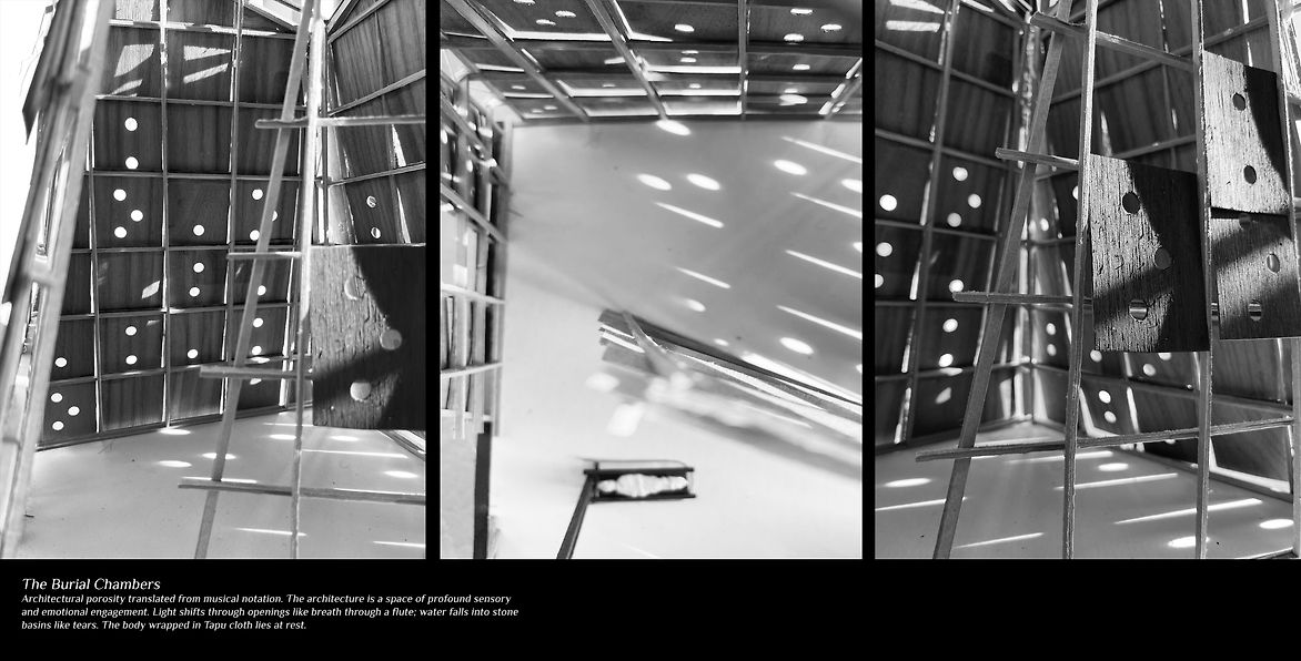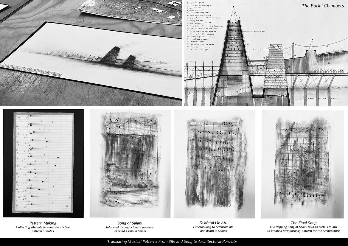 The burial chambers are not only commemorative but resilient. Constructed with thick, porous walls informed by musical notations derived from the Salani’s climate data and traditional Samoan funeral chant, the musical patterns are translated to architectural porosity, allow rainwater and wind to pass through the perforations, creating an elegiac soundscape of water dripping like tears.