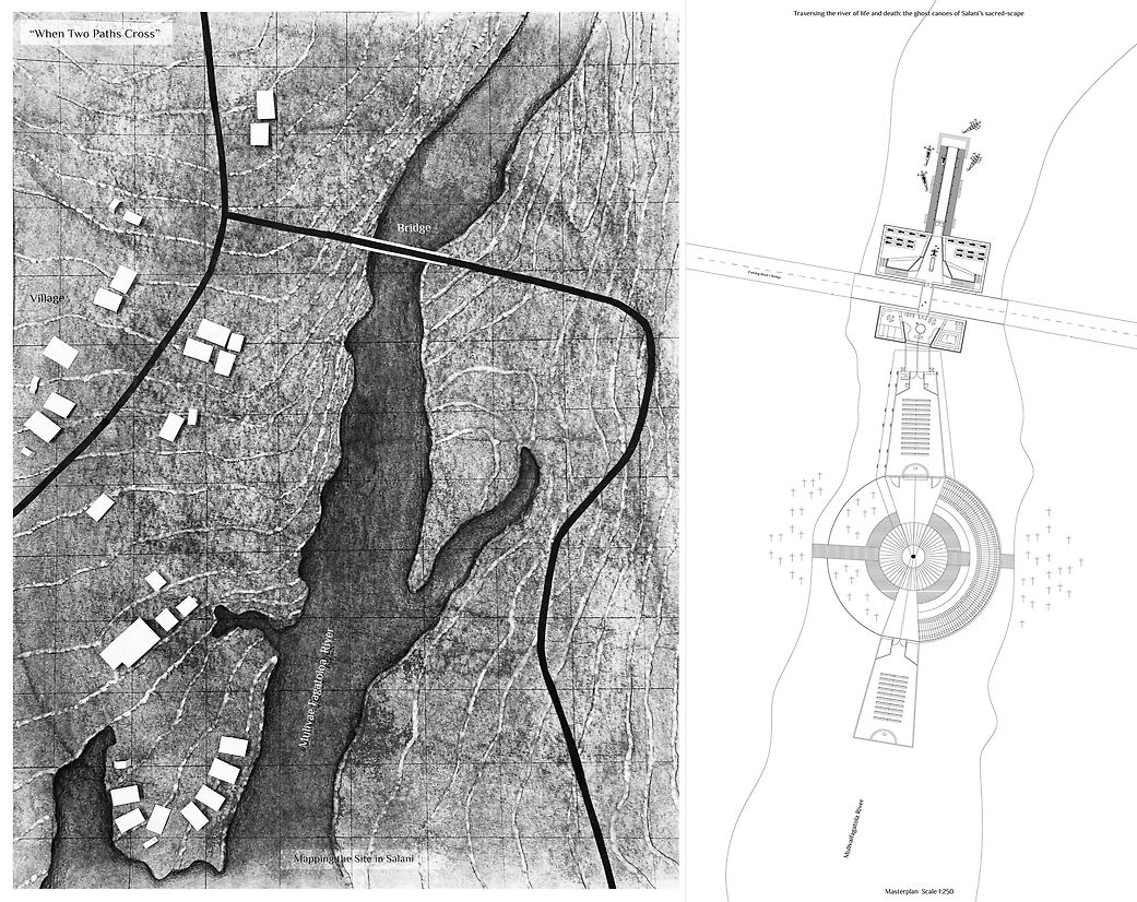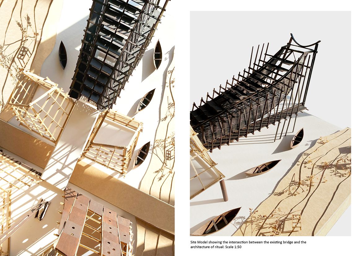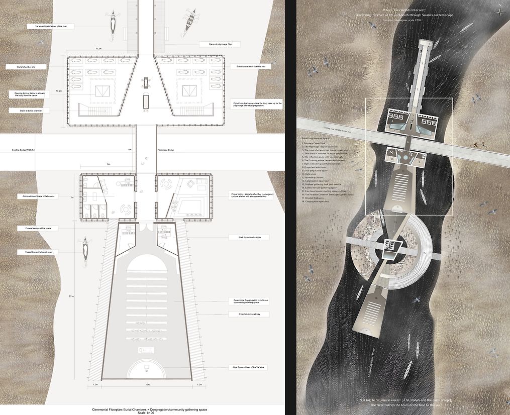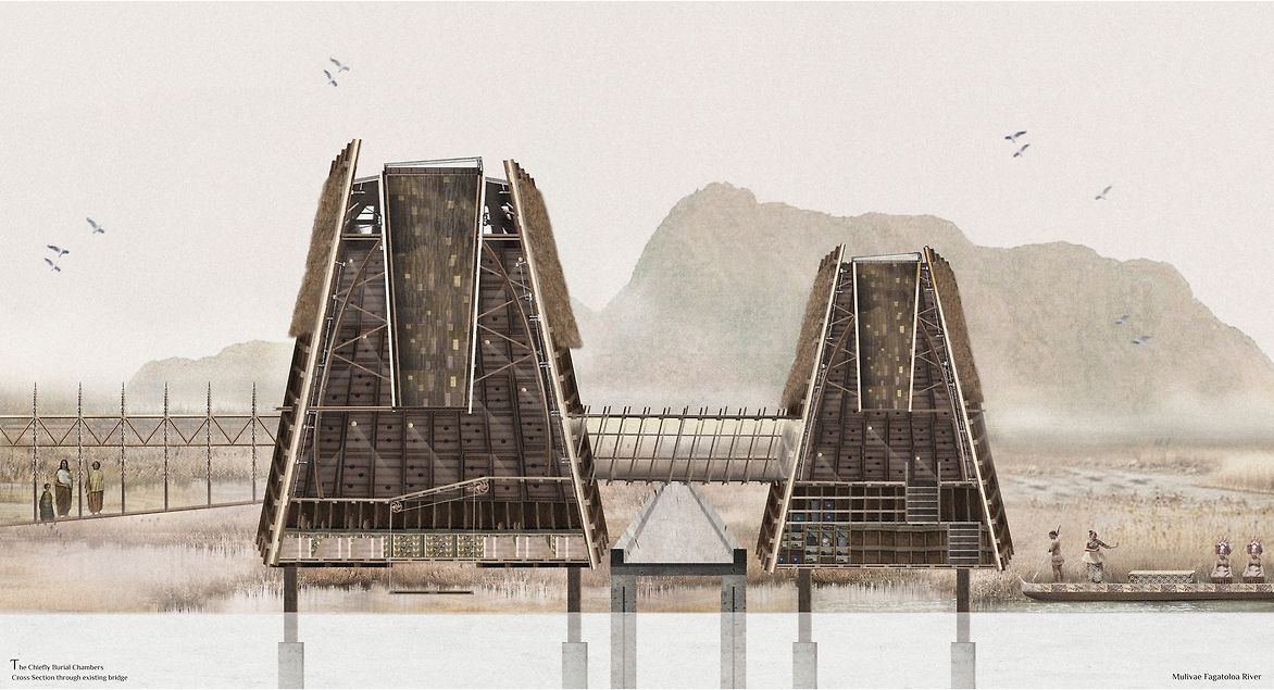 The design intersects an existing bridge on the river, this perpendicular axis of intersection captures the metaphorical crossing of two worlds; between earthly and spiritual. It offers the Salani community a space to farewell their loved ones, rooted in Fa‘asamoa and the tradition of collective ritual, song, and procession. The architecture engages deeply with the Samoan belief in Le Va Tapuia; the sacred relational space between people, land, water, and spirit.