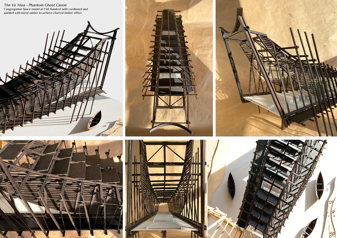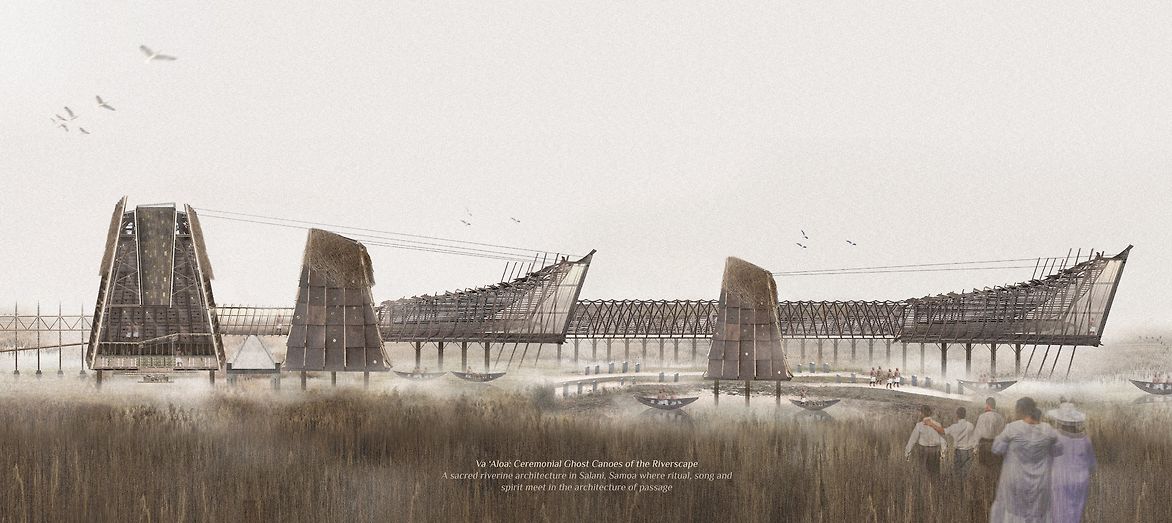 The ritual architecture drifts along the flow of the Mulivae Fagatoloa River in the village of Salani, Samoa. A place where ceremony, grief, and memory come together through the senses the design is a spatial soundscape of connection to land, water and spirit. Inspired by the Samoan concept of Va ‘Aloa, or the Ghost Canoes that once ferried of chiefly spirits from mountain to sea, the architecture is envisioned as vessel structures and burial chambers that navigate the boundary between the earthly and spiritual realms. A place where metaphor becomes material, where stories are cast in stone and song, and where the river carries not only water, but memory.